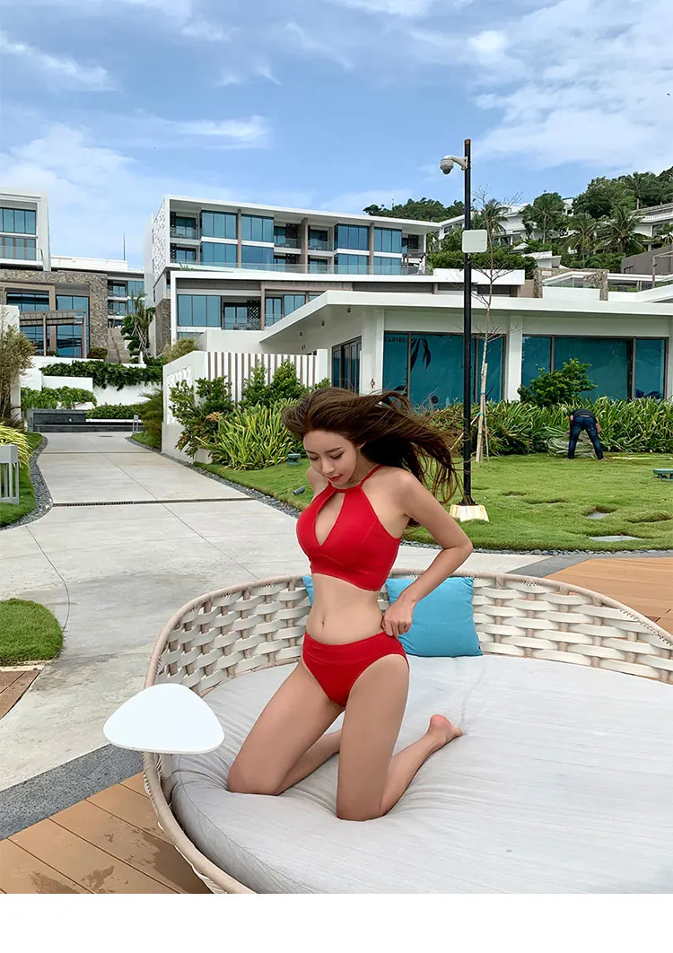 Женский купальник с заниженной талией, красный купальник в Корейском стиле с высокой горловиной, 2020