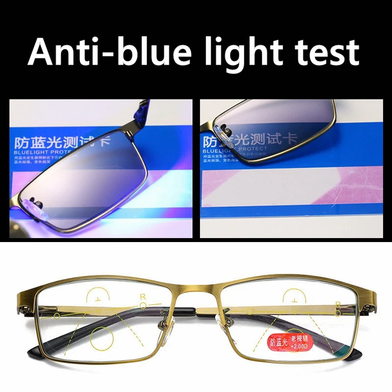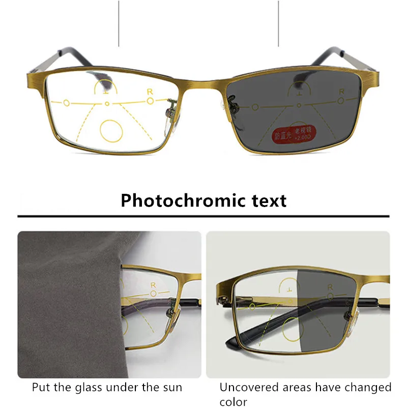Высококачественные фотохромные очки для чтения, мужские прогрессивные Мультифокальные очки из смолы с защитой от синего света, пресбиопические очки с металлической оправой 15