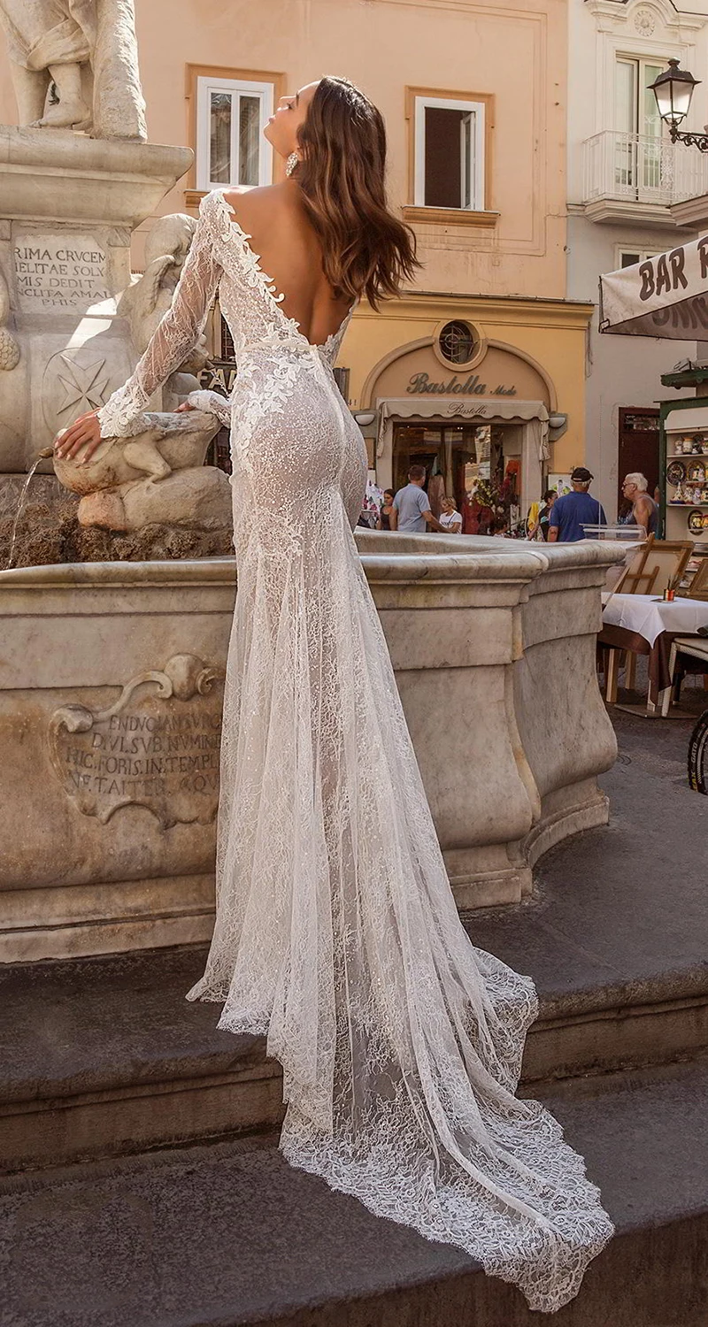 Очаровательное кружевное свадебное платье с рукавами и глубоким кру...