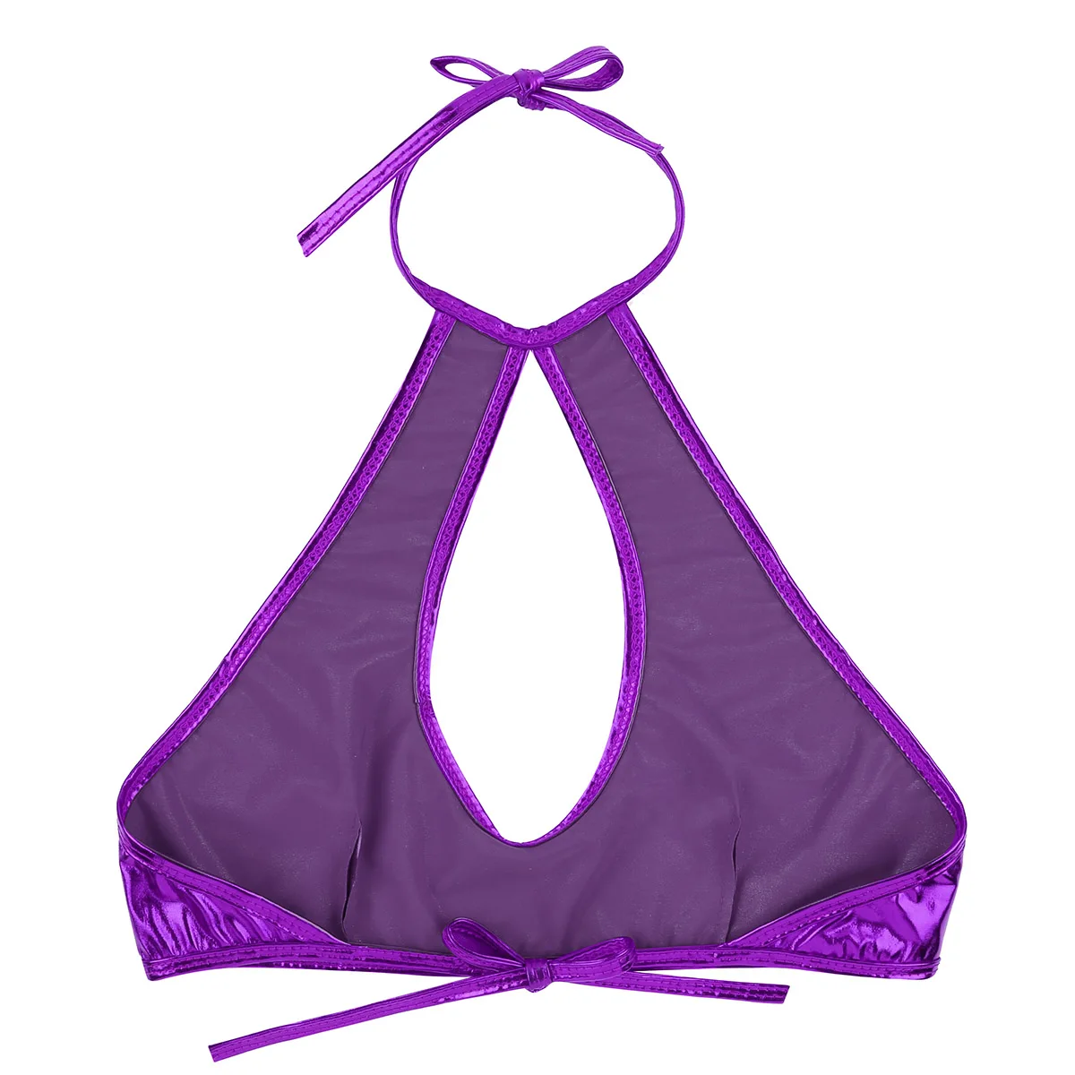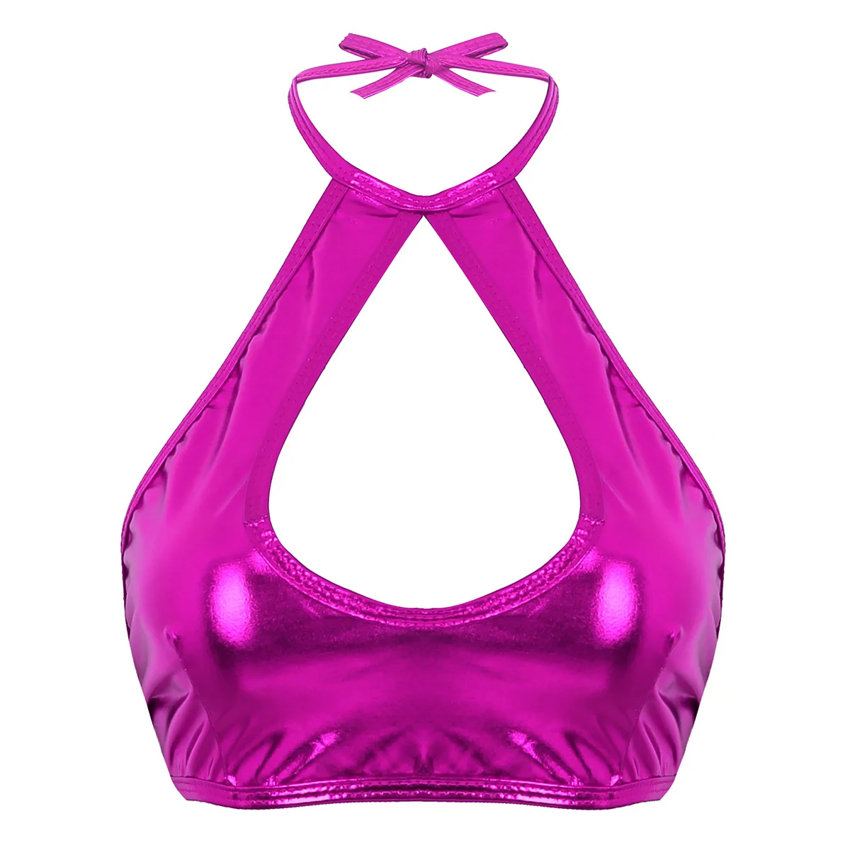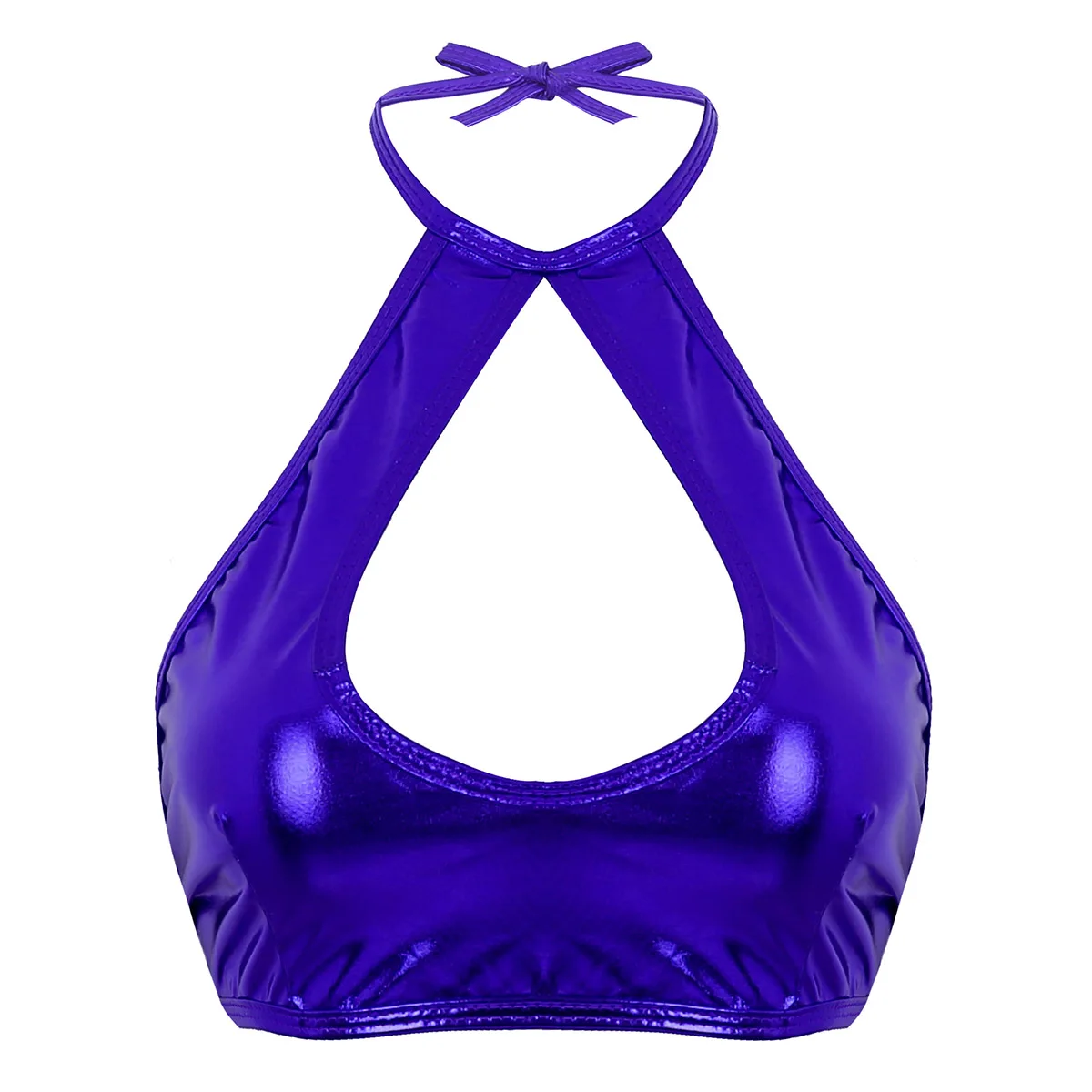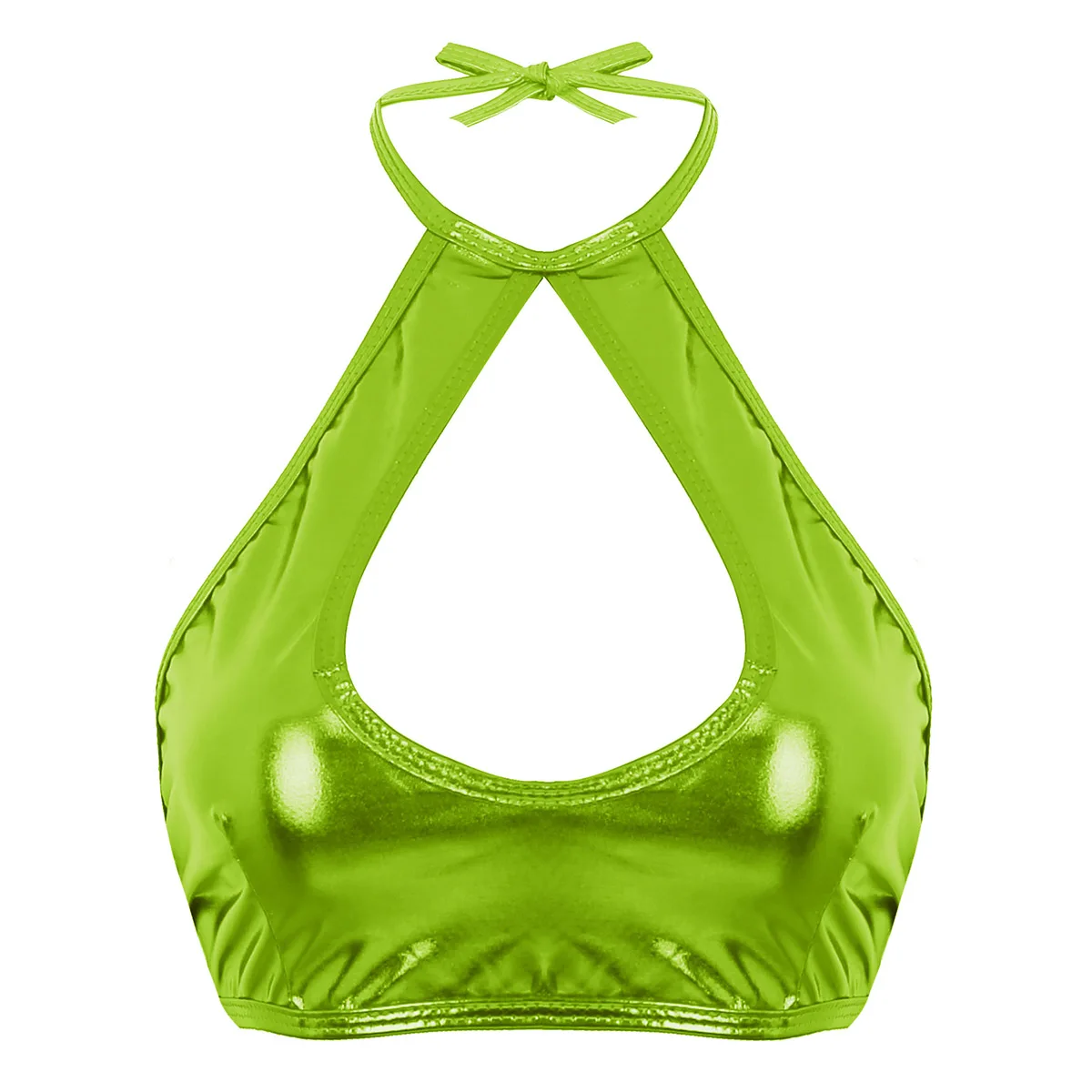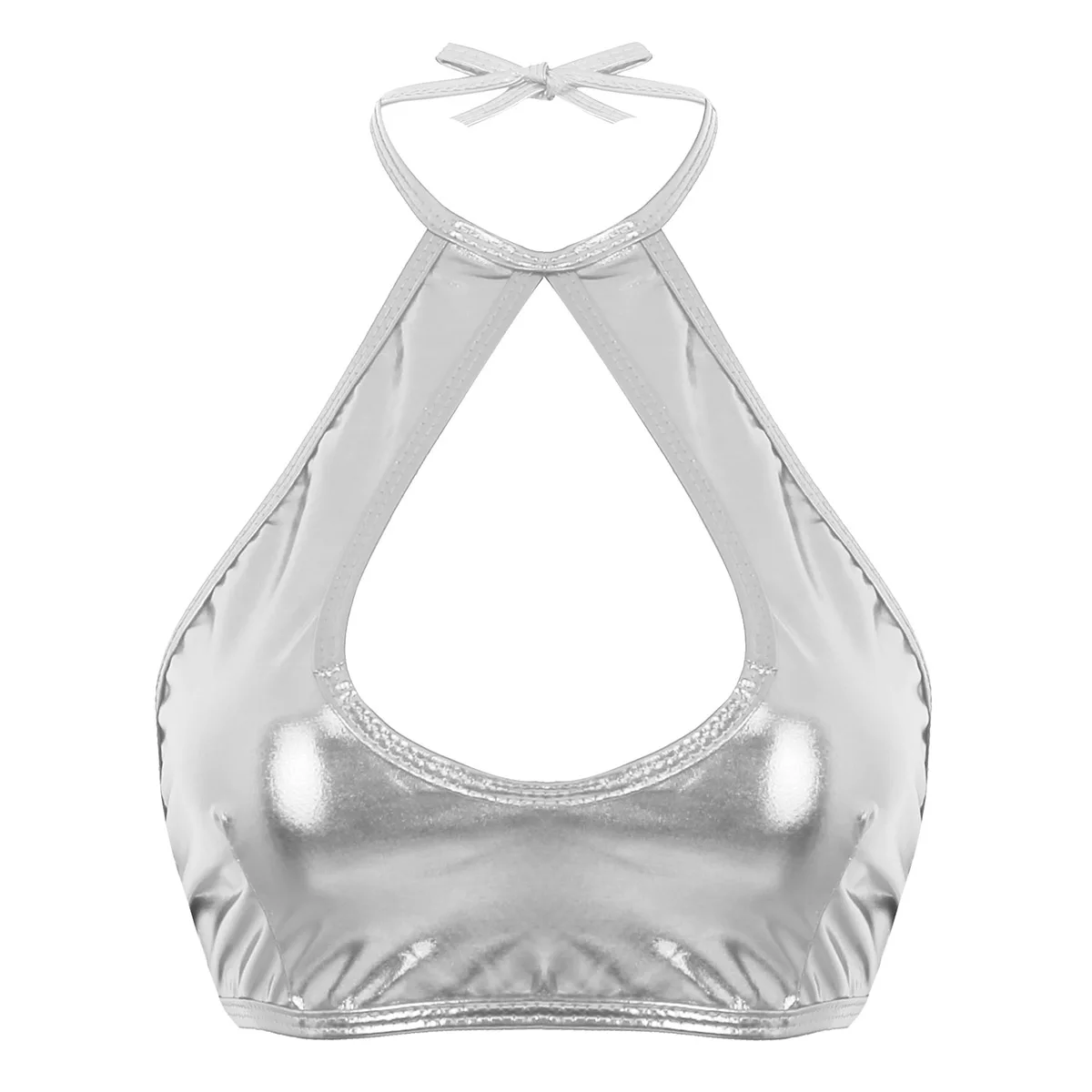 Женский блестящий топ из искусственной кожи, с лямкой на шее, сексуальный топ для ночного клуба и вечеринок, сценический костюм для танцев на Пилоне, фестивальный рейв