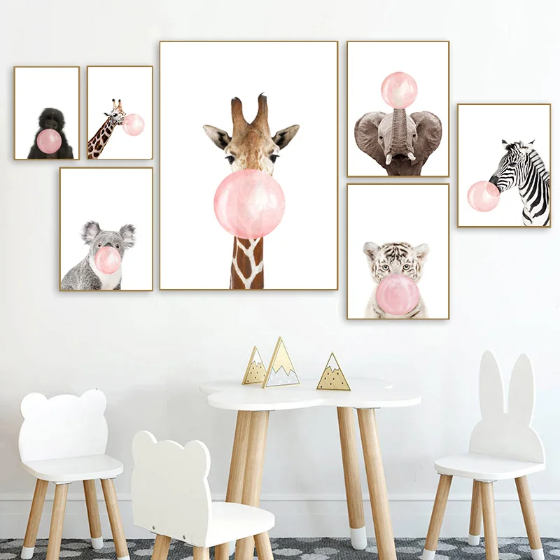 Милый жираф постер с зеброй детская комната выдув розовые пузырьки Животные Стена искусство холст искусство фотообои для детской комнаты декор