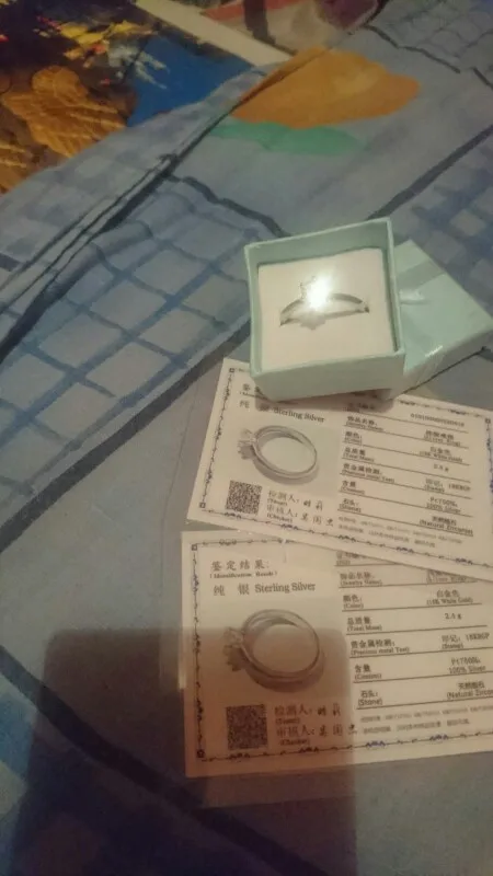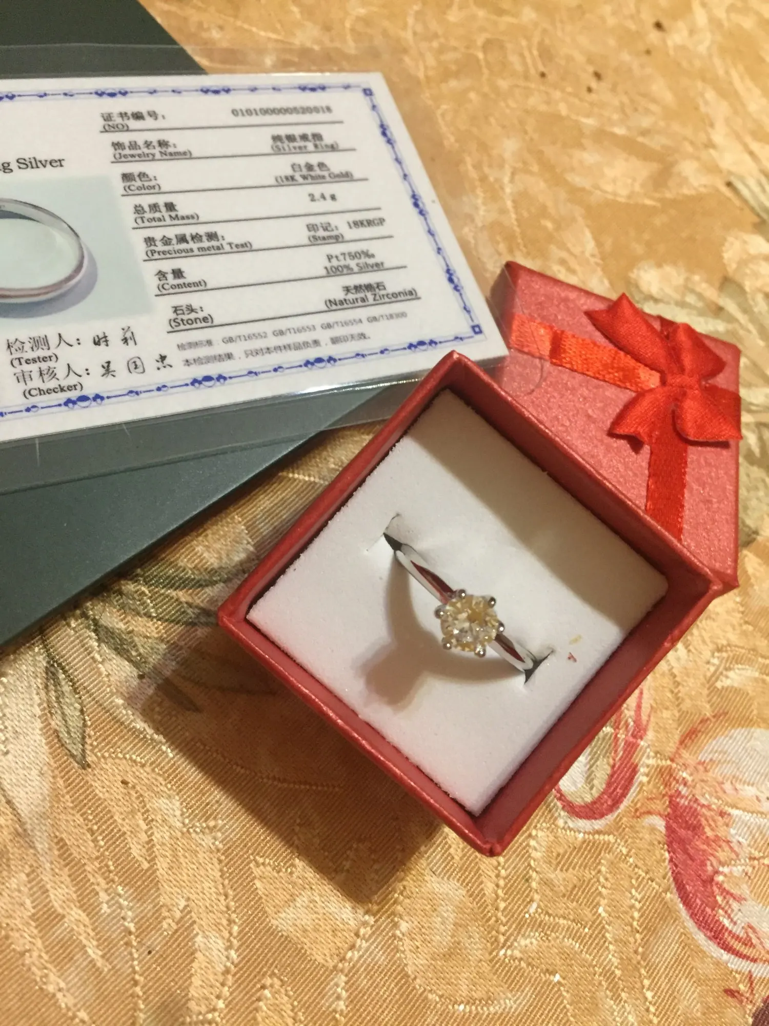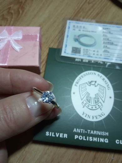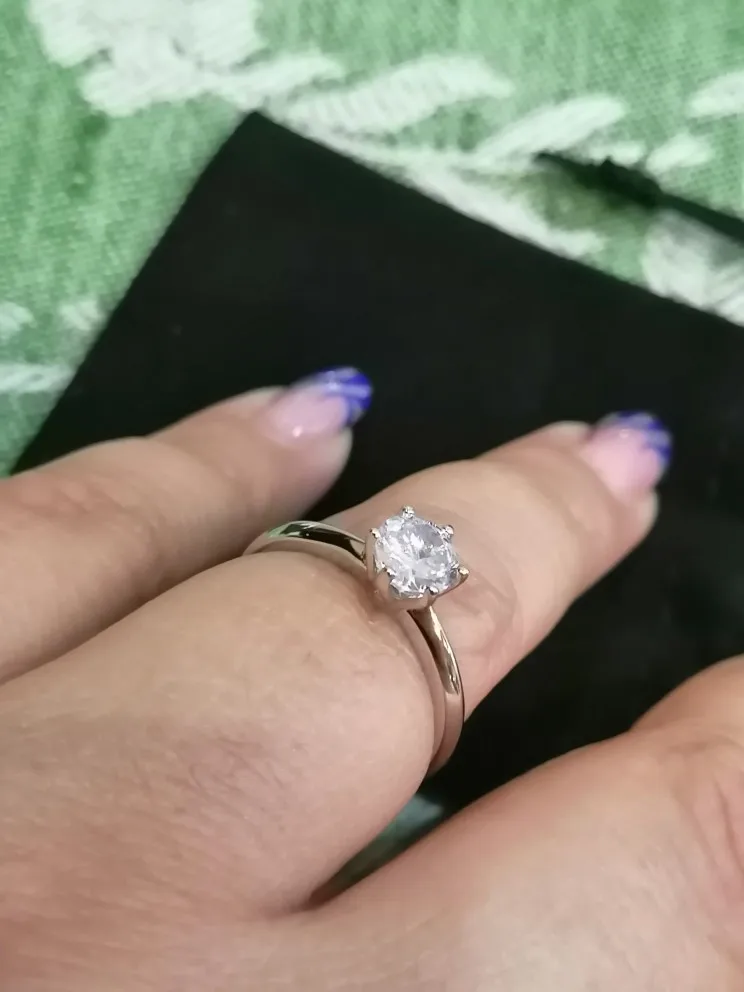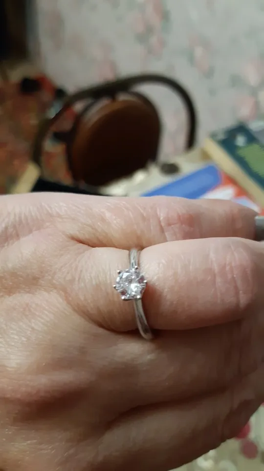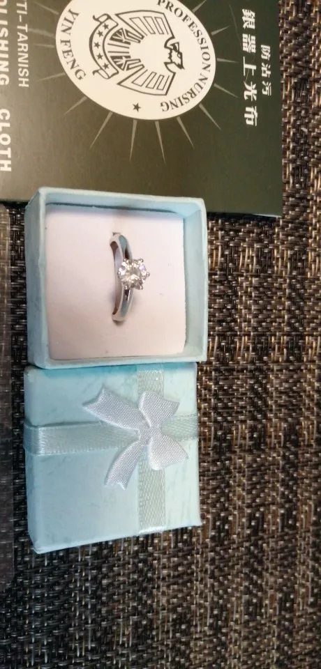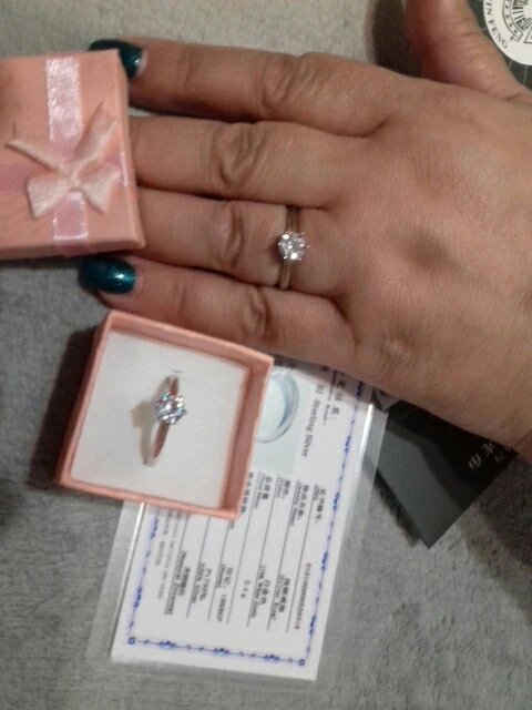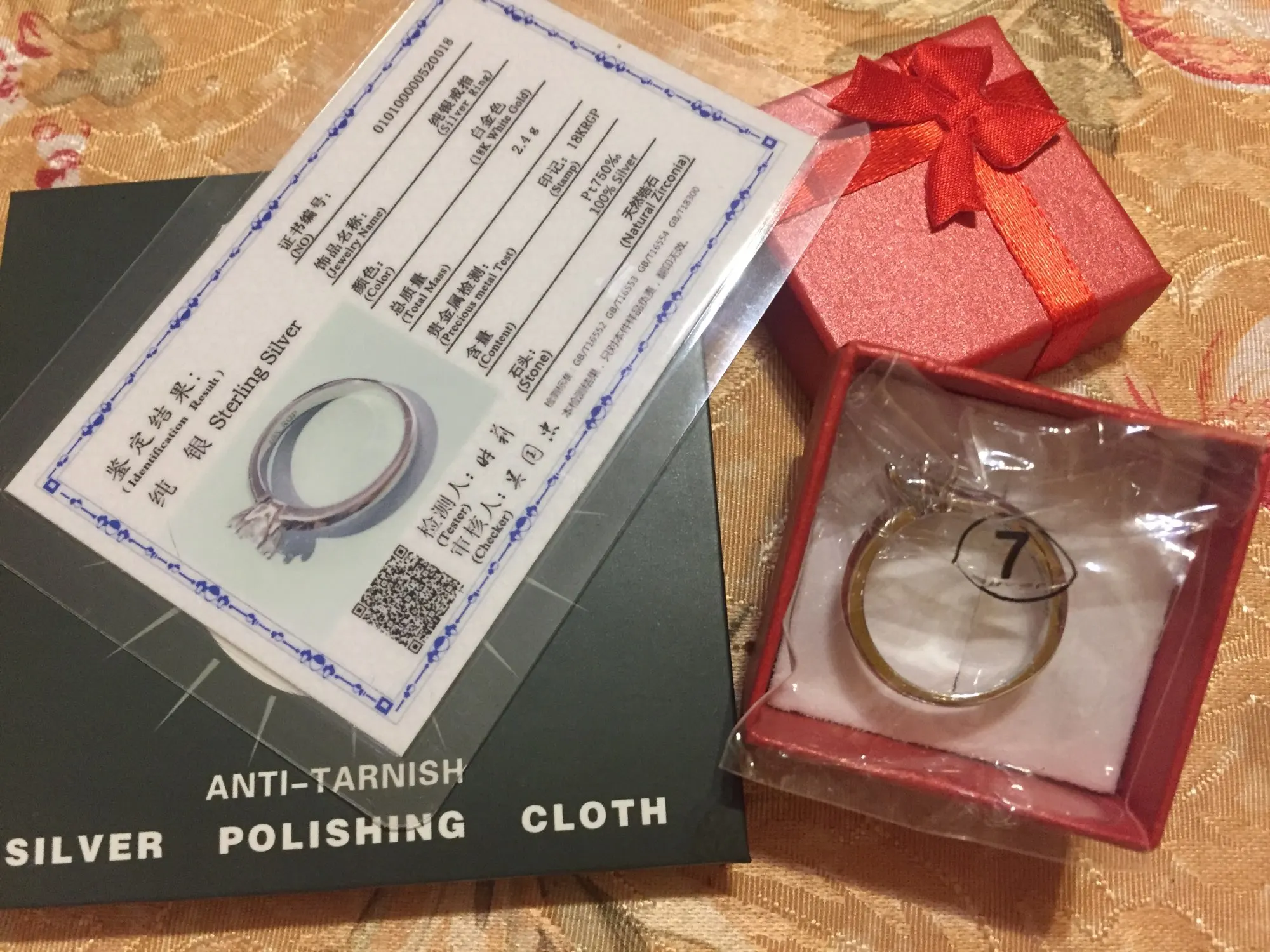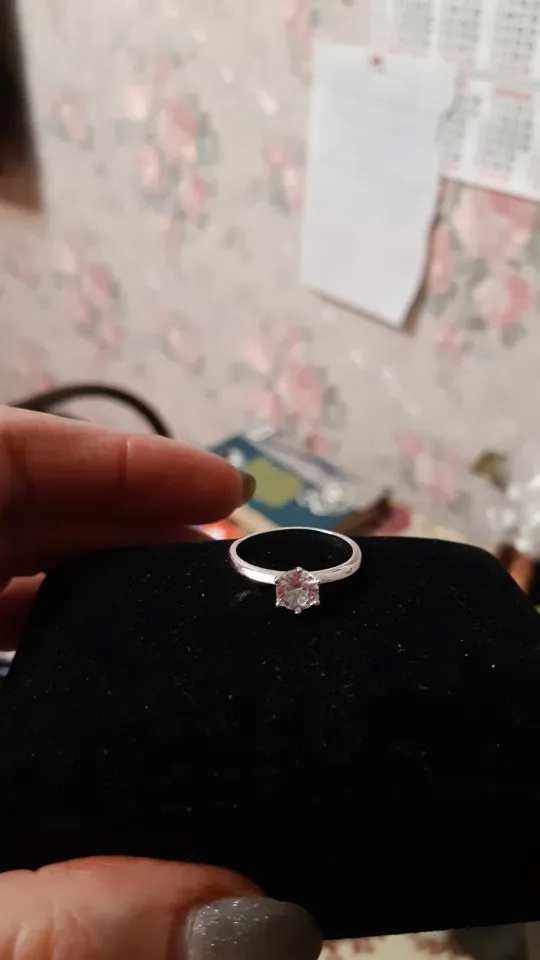 Красивое кольцо. Выглядит как кольцо с настоящим бриллиантом. Он поставляется с сертификатом, который указывает на фактический материал (серебро и некоторые камни) и с маленькой милой коробкой. Он также поставляется с тканью для полировки кольца. Я купил еще два в качестве подарка, потому что это так красиво