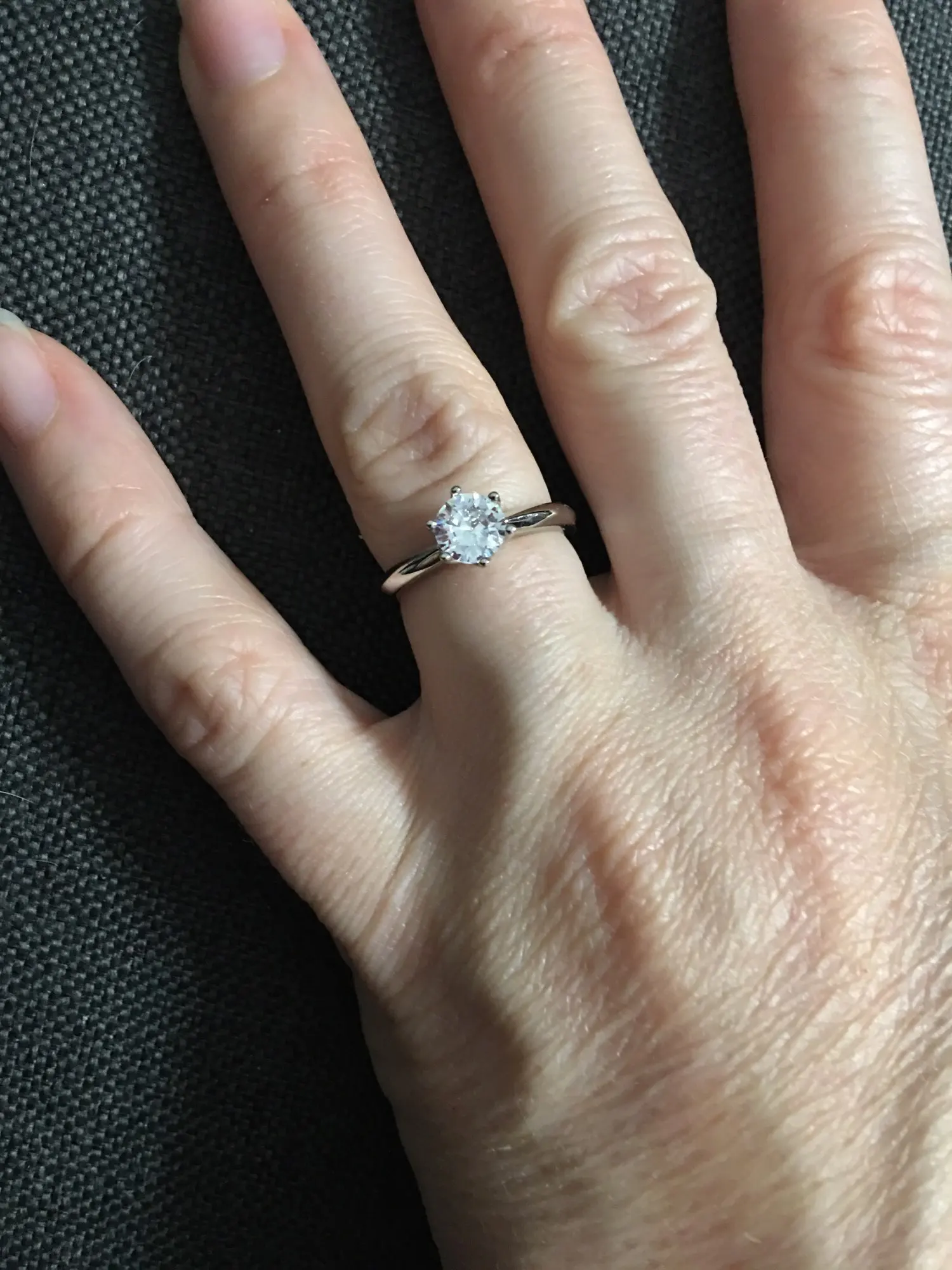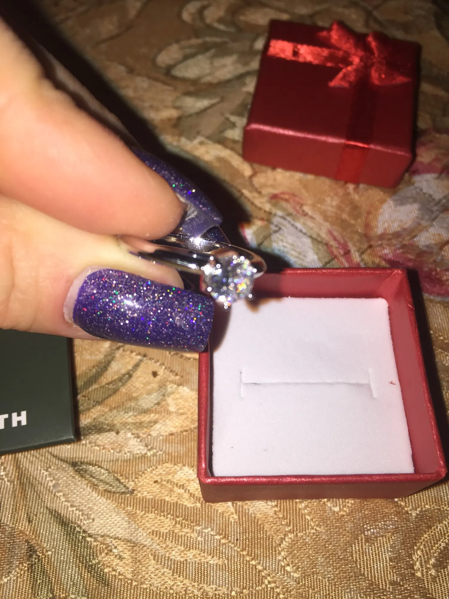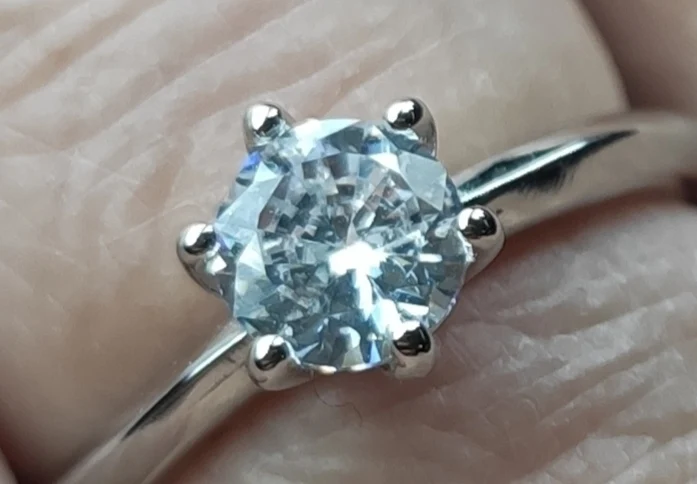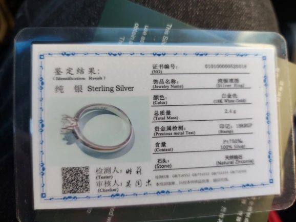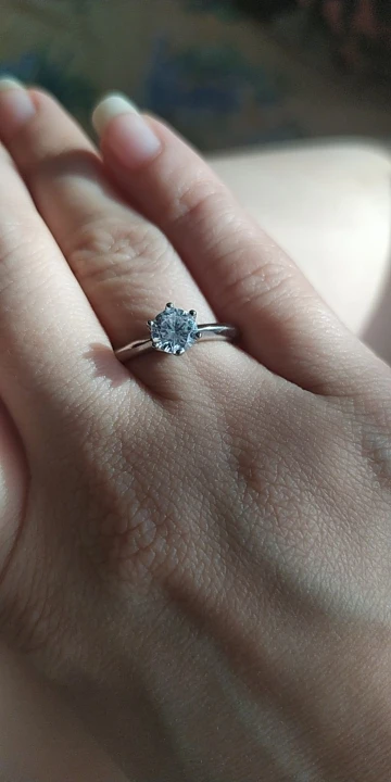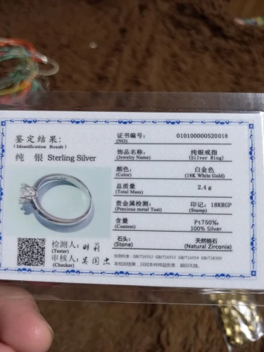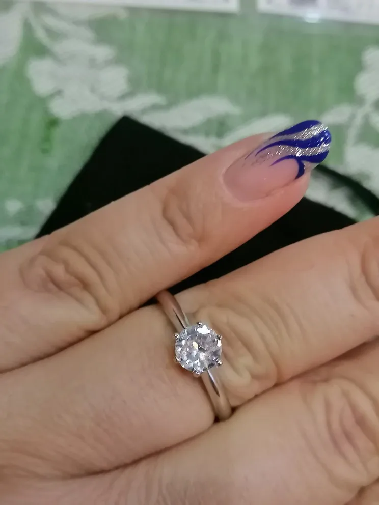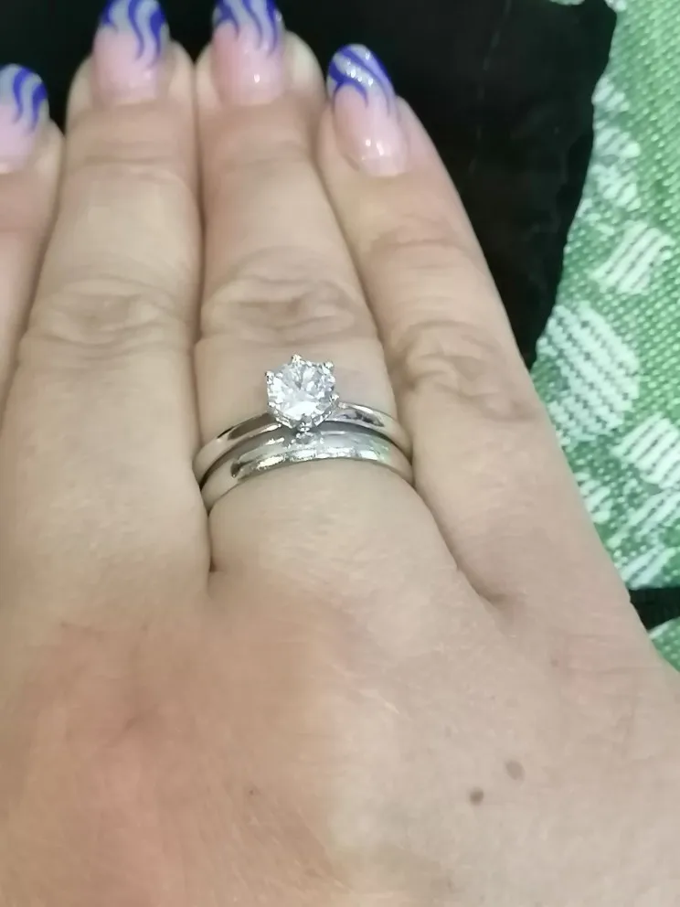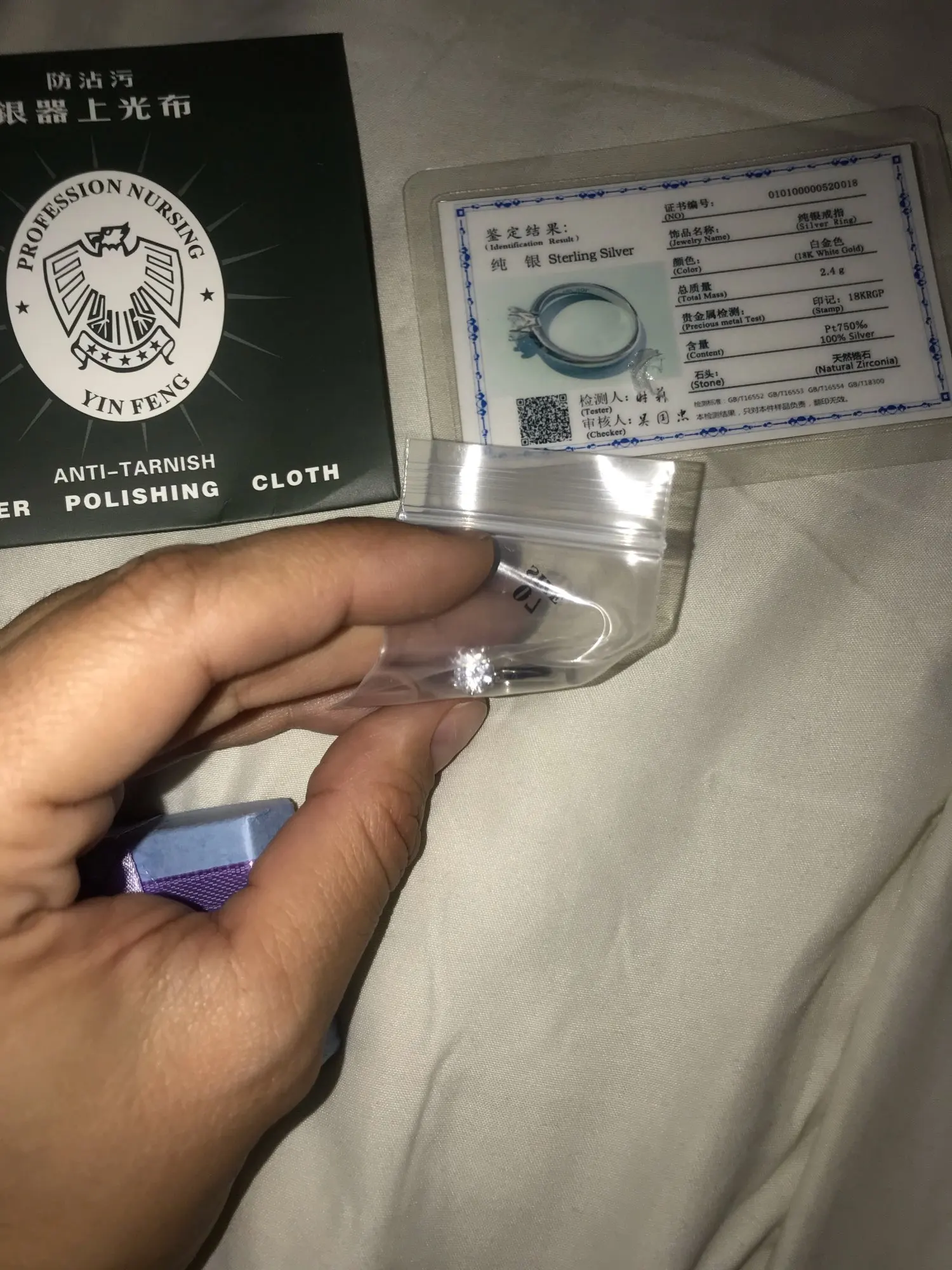 Красивое кольцо. Выглядит как кольцо с настоящим бриллиантом. Он поставляется с сертификатом, который указывает на фактический материал (серебро и некоторые камни) и с маленькой милой коробкой. Он также поставляется с тканью для полировки кольца. Я купил еще два в качестве подарка, потому что это так красиво