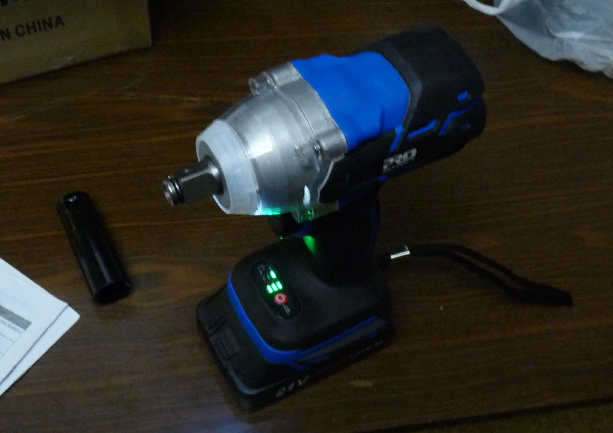 Итак, начнём брал два, пришли разные. один с винтами торкс (почему-то без наклейки с режимами), второй я так понял более новый с винтами под крестовую, изготовлен чутка похабнее. в коробку и того и другого продавец "забыл" положить резиновое кольцо и штифт, ну и хер с ними сделал сам. тот что на торксах умеет останавливать вращение когда крепёж сдаётся. функция не отключается, либо я не разобрался, работает функция на максимальной скорости при любой силе давления на кнопку. привык к воздушному поэтому не сильно мне нужна такая чушь, а то и мешает потому что открутить те же колеса на чистых длинных шпильках пришлось бы сперва отдать, а потом переключившись на режим слабее уже открутить. тот что на винтах чутка сильнее подсветка, ну совсем кропали. сильнее крутит на максимальном режиме и слабже на минимальном, не имеет вышеописанной функции директ и нет возможности её активировать, хотя горит как будто включена. продавец даёт тупые советы вроде как нажмите на кнопку и всё будет воркать.