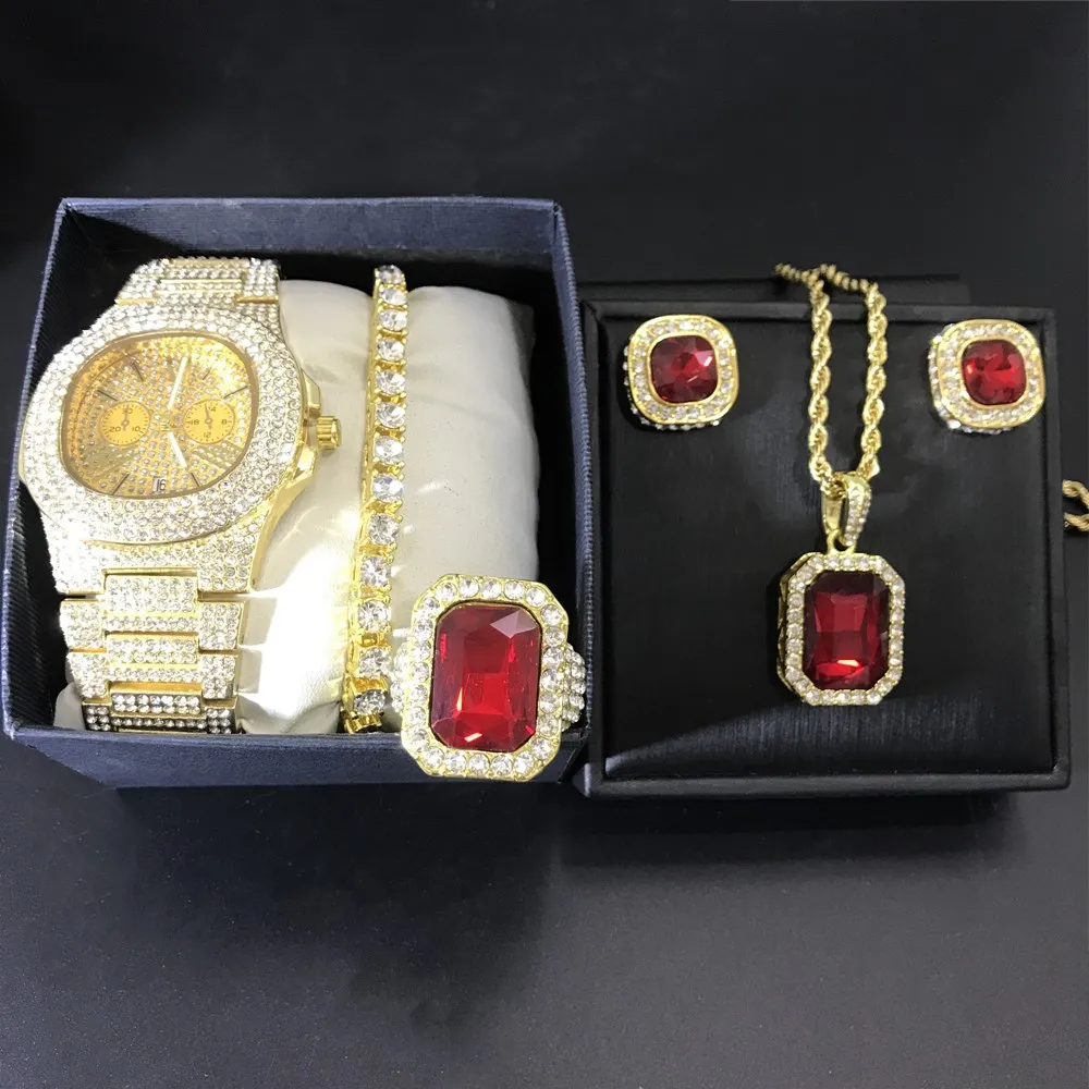 Роскошные мужские золотые часы с бриллиантами, мужские часы, ожерелье, браслеты, серьги и кольцо, комплект из кубинской бижутерии, хип-хоп для мужчин