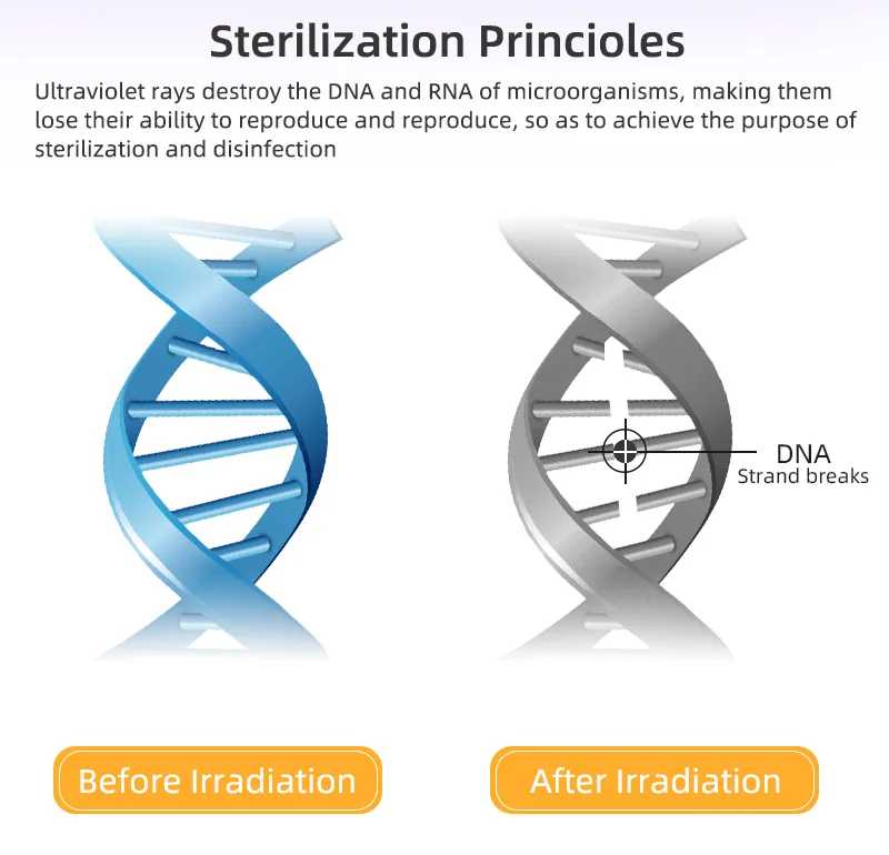 1.UVC лучи вредны для глаз и кожи, поэтому, когда лампа включена, не смотрите прямо на лампу. Когда свет работает, люди/Домашние животные/растения должны выйти из комнаты.
