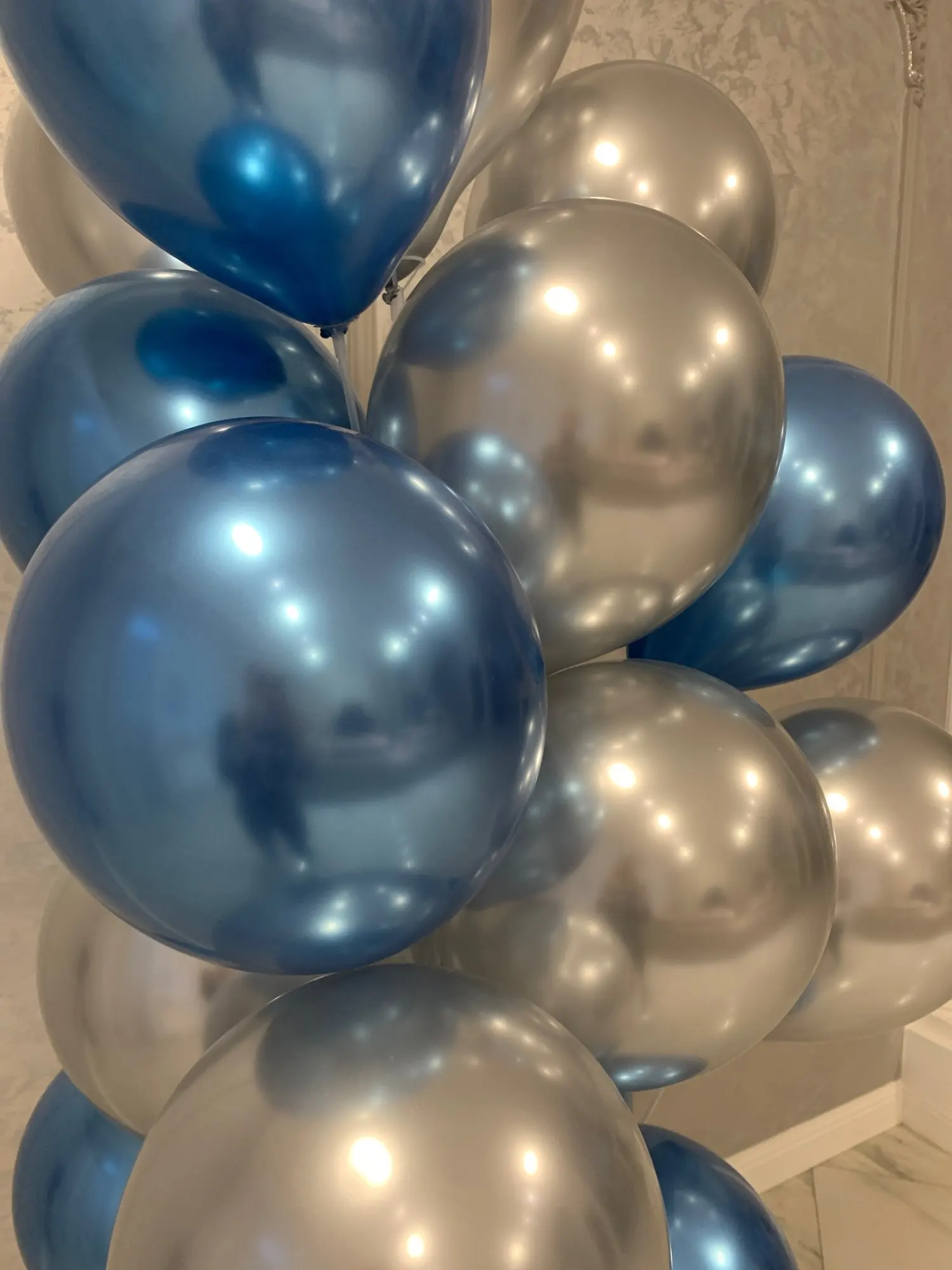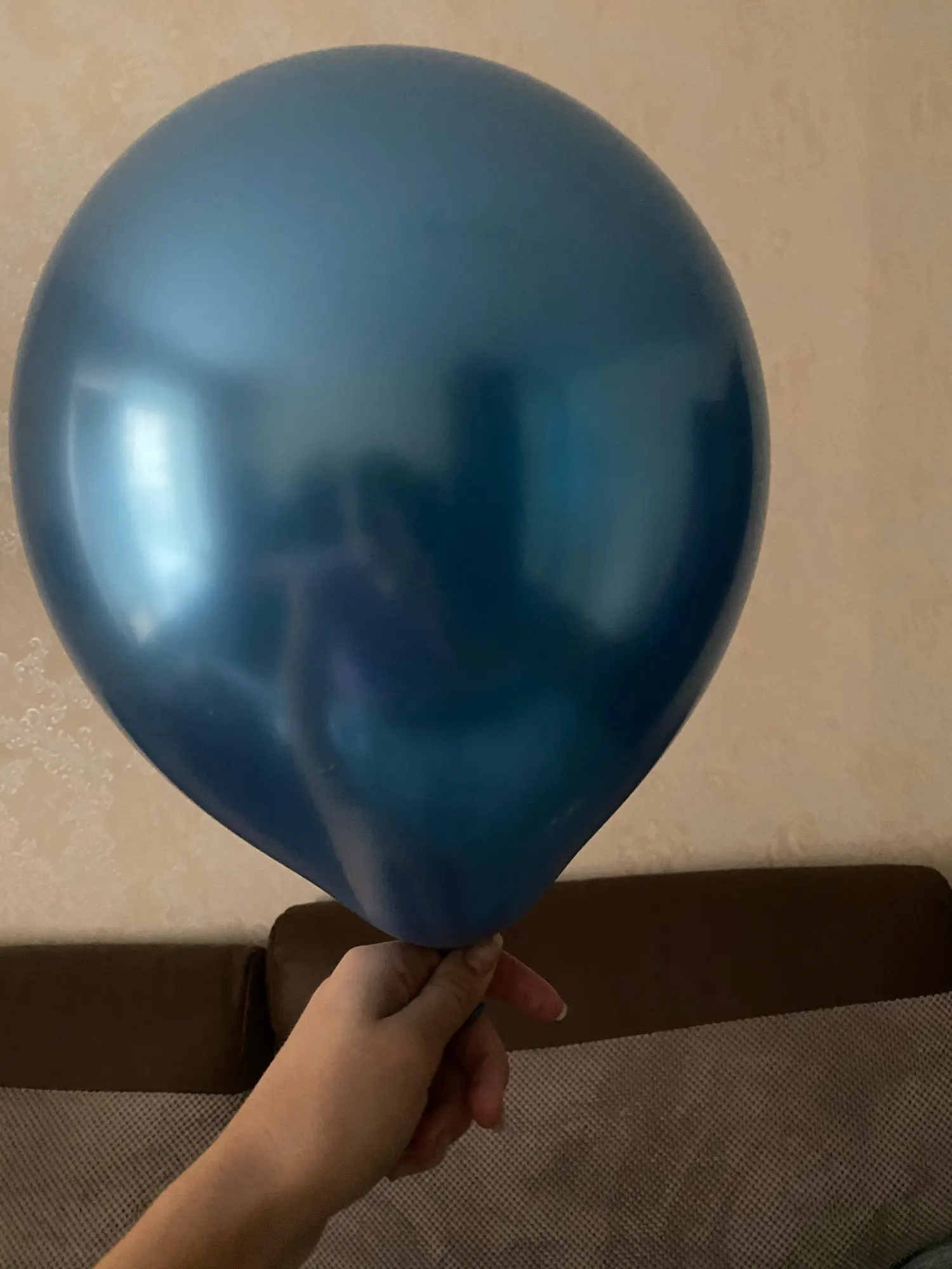 Как на фото! Крутые шары! Плотные! Хром - не перламутр, что оч порадовало! Выбрала самые большие 50 штук, но пришло 49 (! Серебристые больше чем синие, но не на много! До конца не надувала! Пока надула 19 шт...из них 1н брак! В целом довольна!
