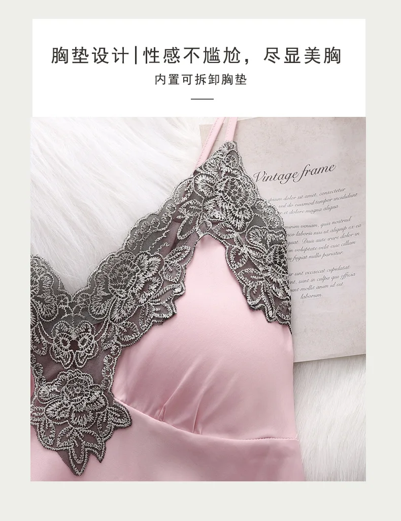 Пижамный комплект Женский атласный из 5 предметов, шелковая ночная рубашка на бретелях-спагетти, кружевная Пижама с подушечками для сна
