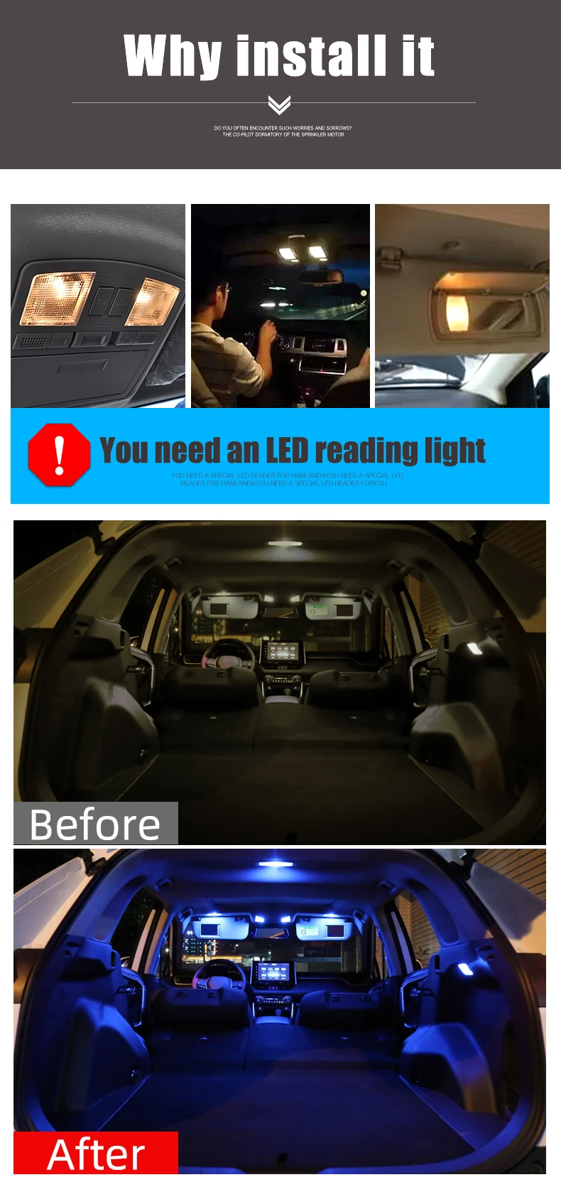 Количество: 6 шт.Включает: передний светильник для чтения (2 шт.)Задний светильник для чтения (1 шт.)Автомобильный солнцезащитный козырек косметический зеркальный светильник (2 шт.)Светильник для багажника/грузового пространства (1 шт.)(Чип на плате) Срок службы: 50000 часов