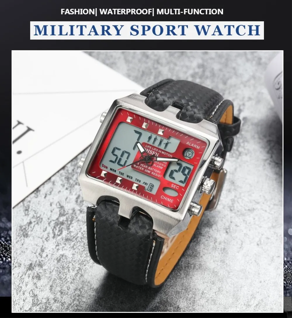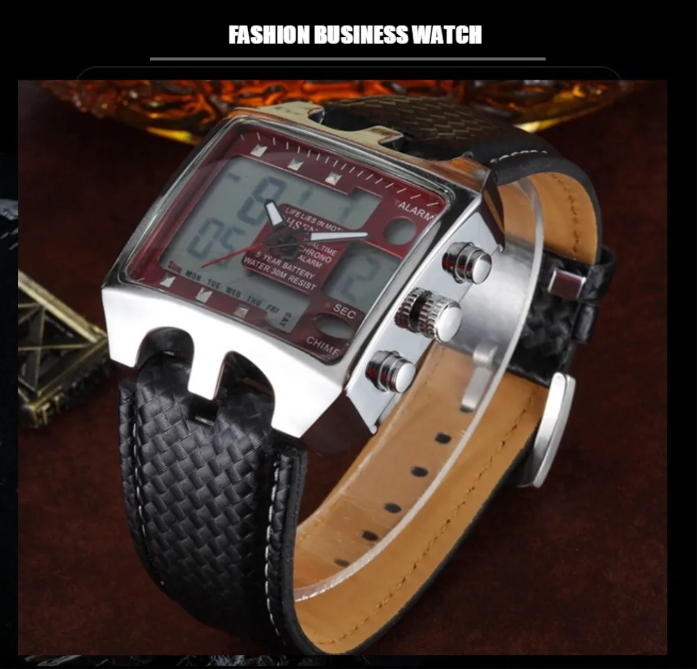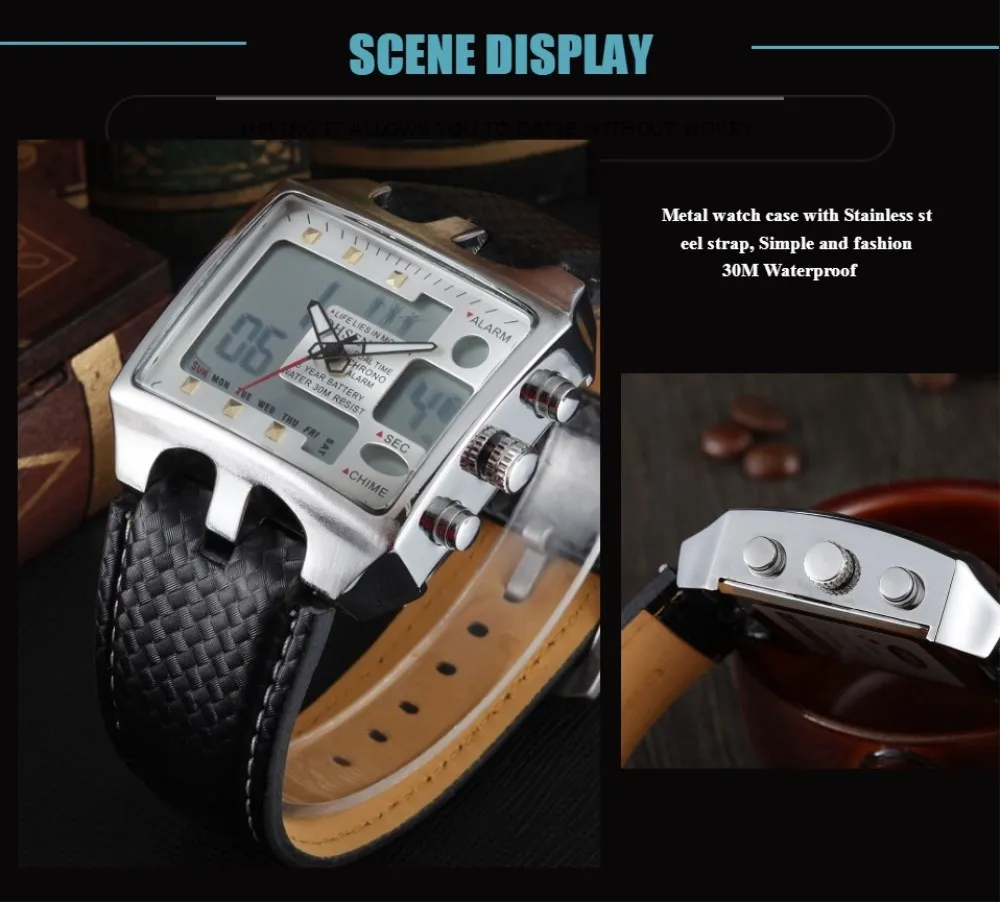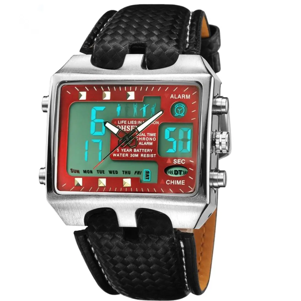 Бренд: OHSEN Пол: Для мужчин стиль: бег, езда на велосипеде, плавание, повседневный материал корпуса: акрил Материал ремешка: кожа тип пряжки ремешка: нержавеющая сталь Пряжка часы циферблата: квадратный Диаметр циферблата: толщина корпуса 48 мм: 15 мм ширина ремешка: около 33 мм Водонепроницаемость Глубина: 5 бар цифровое Время и указатель времени двойной функции отображения: 5 бар водонепроницаемость, хронограф, будильник, 12/24 часа, двойное время, дата, месяц, Особенности: светодиодный дисплей, Круглый, силиконовый ремешок, Пряжка из нержавеющей стали, очки из смолы глубина водонепроницаемости до 5 бар, можно плавать с ним (пожалуйста, не нажимайте на клавиши под водой) Комплектующие: -1 х Оригинальные часы OHSEN-1 х Руководство по использованию-упаковано в пузырчатый крафт-конверт (внутренний простая сумочка из ПВХ)