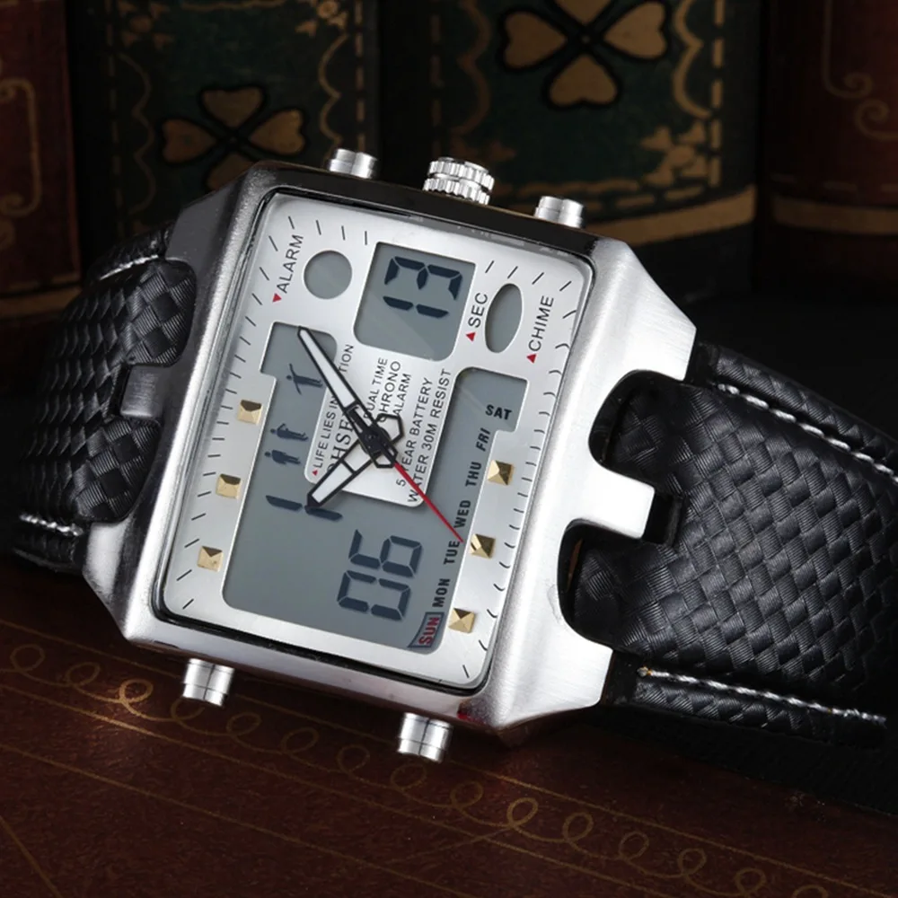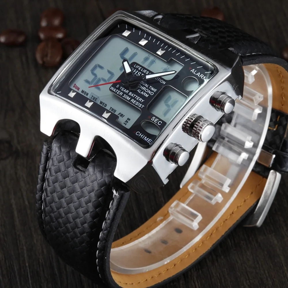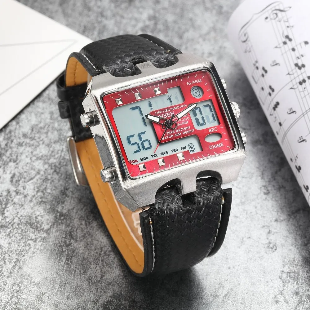 Бренд: OHSEN Пол: Для мужчин стиль: бег, езда на велосипеде, плавание, повседневный материал корпуса: акрил Материал ремешка: кожа тип пряжки ремешка: нержавеющая сталь Пряжка часы циферблата: квадратный Диаметр циферблата: толщина корпуса 48 мм: 15 мм ширина ремешка: около 33 мм Водонепроницаемость Глубина: 5 бар цифровое Время и указатель времени двойной функции отображения: 5 бар водонепроницаемость, хронограф, будильник, 12/24 часа, двойное время, дата, месяц, Особенности: светодиодный дисплей, Круглый, силиконовый ремешок, Пряжка из нержавеющей стали, очки из смолы глубина водонепроницаемости до 5 бар, можно плавать с ним (пожалуйста, не нажимайте на клавиши под водой) Комплектующие: -1 х Оригинальные часы OHSEN-1 х Руководство по использованию-упаковано в пузырчатый крафт-конверт (внутренний простая сумочка из ПВХ)
