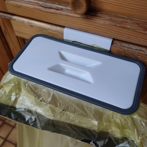 20리터 쓰레기봉투에 잘 맞습니다. 밀폐는 잘됨. 하중은 아직 무거운 거 안 넣어봐서 얼마나 견딜지 모름. 문고리 걸이는 싱크대 문 두께보다 얇아서 싱크대 문 손잡이에 걸어서 사용하면됨.