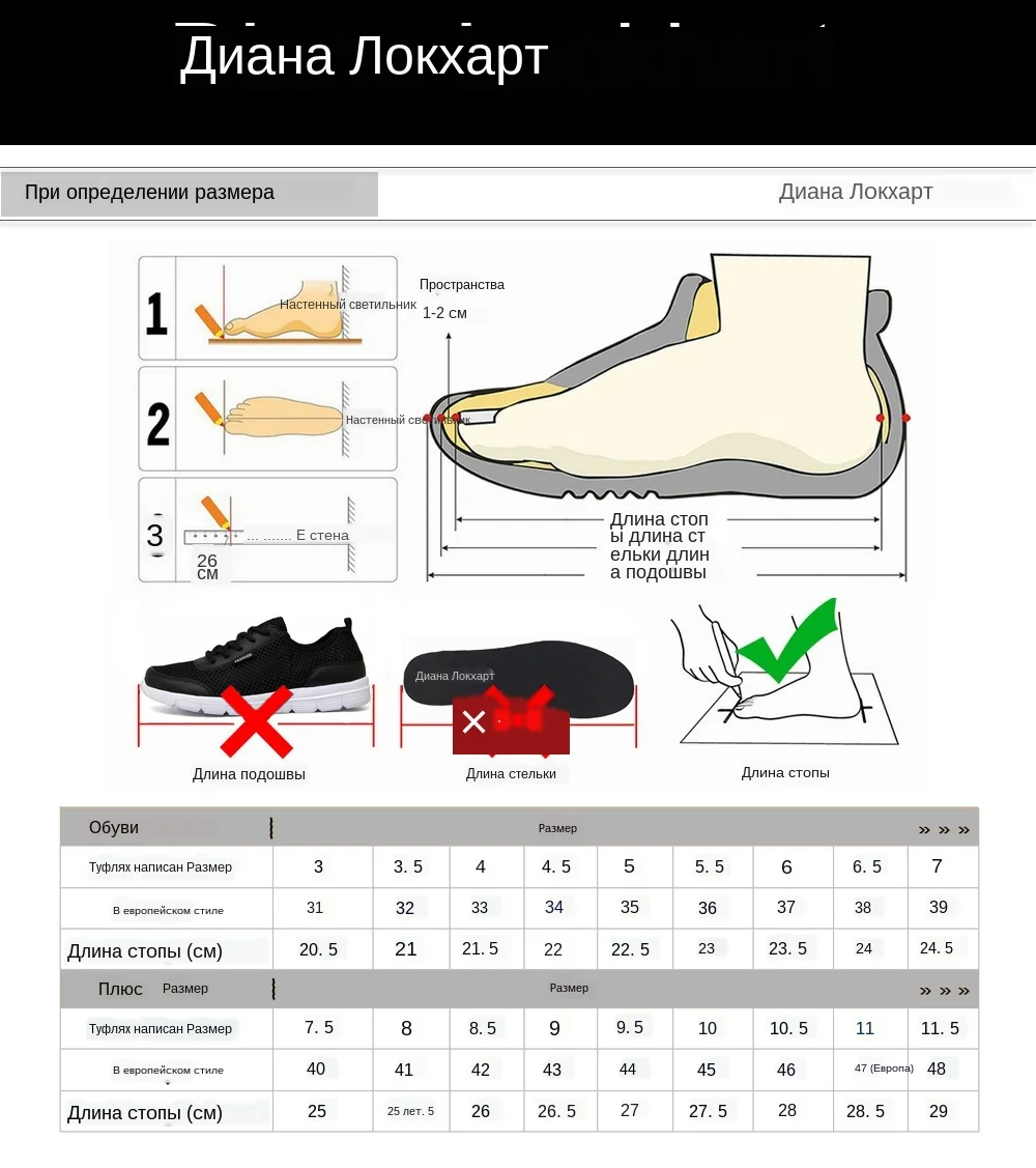 Дорогой друг, при заказе, пожалуйста, выбирайте размер США в соответствии с длиной Вашей стопы, если вы не уверены в ней, пожалуйста, сообщите нам длину вашей стопы (без размера вашей страны) мы можем быстро предложить вам размер, спасибо. Стандартный размер изделия США 4,5 = евро 34 = 220 мм (длина голой стопы) США 5 = ЕВРО 35 = 225 мм (длина голой стопы) США 5,5 = 36 = 230 мм (длина голой стопы) США 6 = 37 = 235 мм (длина голой стопы) США 6,5 = Европейский 38 = 240 мм (длина голой стопы) США 7 = Европейский 39 = 245 мм (длина голой стопы) США 7,5 = 40 = 250 мм (длина голой стопы) США 8 = 41 = 255 мм (длина голой стопы) США 8,5 = евро 42 = 260 мм (длина голой стопы) США 9 = ЕВРО 43 = 265 мм (длина голой стопы) США 9,5 = Европейский 44 = 270 мм (длина голой стопы) США 10 = Европейский 45 = 275 мм (длина голой стопы) Размер США 10,5 = Европейский 46 = 280 мм (длина голой стопы) США 11 = Европейский 47 = 285 мм (длина голой стопы) (1 дюйм = 2,54 см, 1 см = 0,3937 дюйма, 1 см = 10 мм) ★Если вы что-то не понимаете, пожалуйста, свяжитесь с онлайн-клиентской службой.