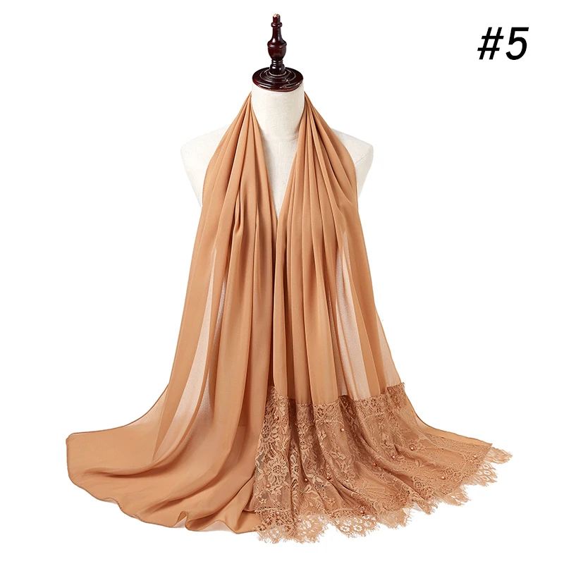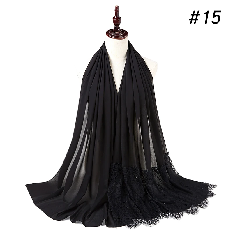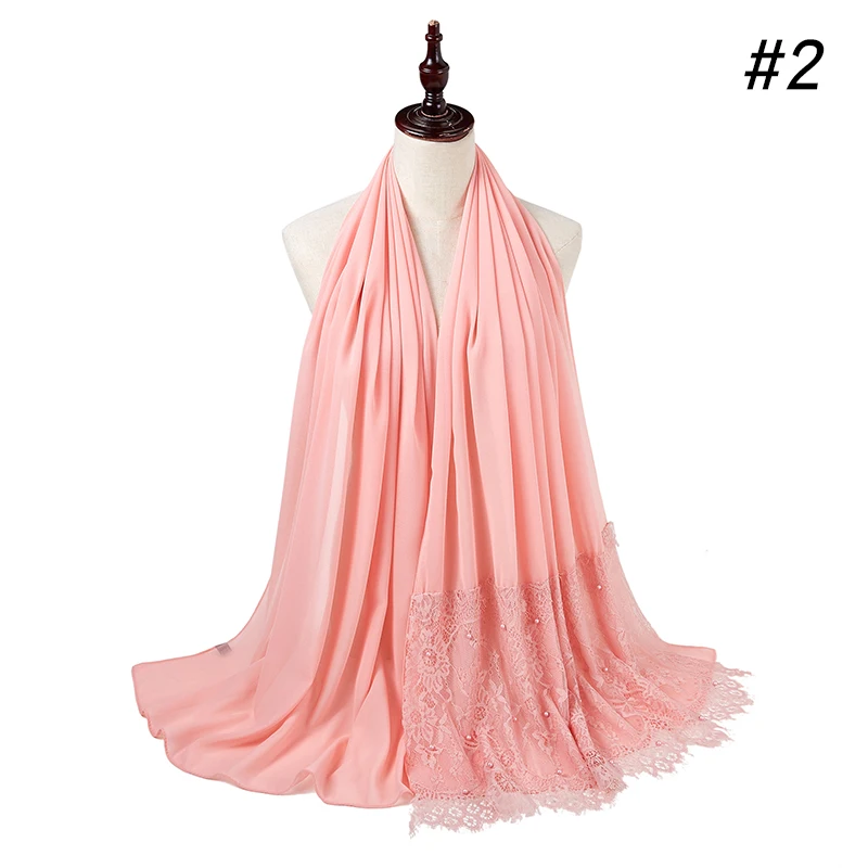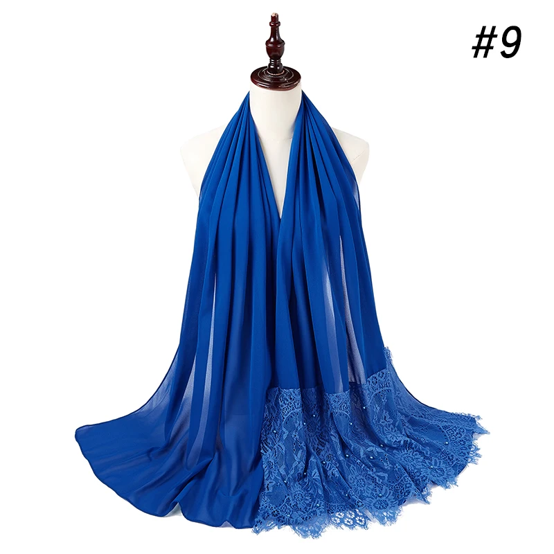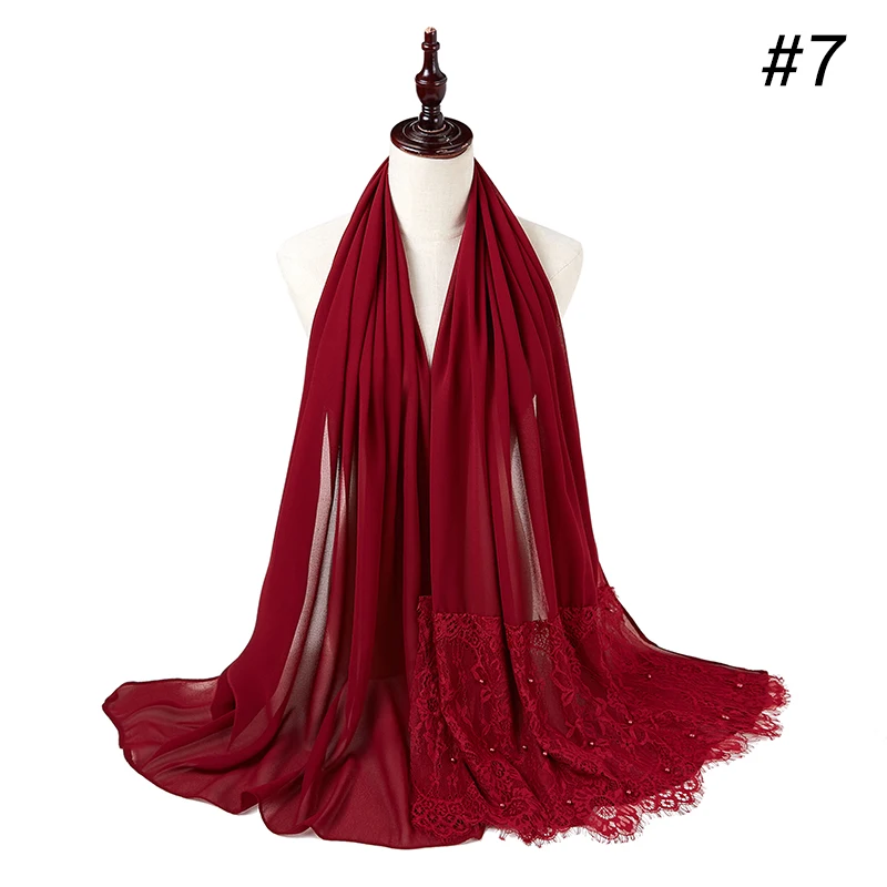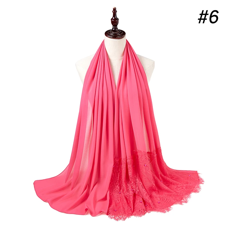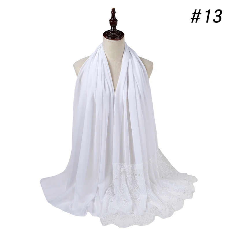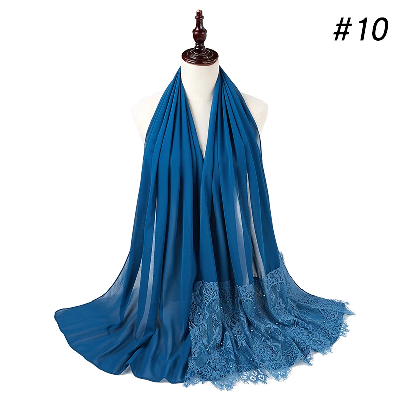 Простой шифоновый кружевной шарф с жемчугом, мусульманский шарф, шаль, мусульманский Однотонный женский шарф, роскошный фуляр, Femme Hijabs, 10 шт.лот