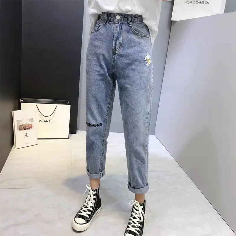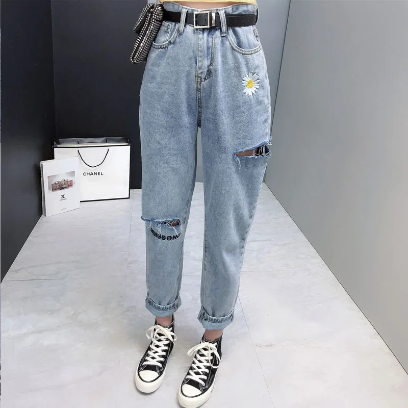 Винтажные джинсовые брюки с цветочной вышивкой и надписью, женские рваные джинсы для женщин, джинсы-бойфренды для мамы, потертые джинсы до щиколотки, C522
