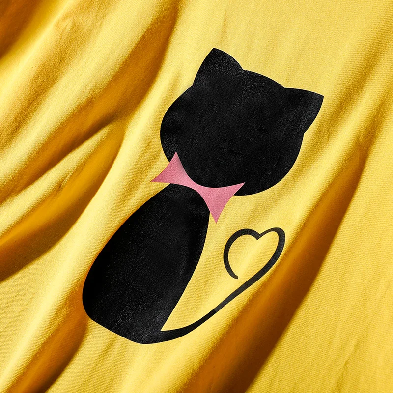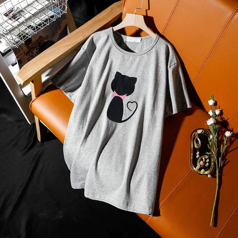 Летние новые модные черные свободные женские топы в корейском стиле, уличный досуг, футболка с короткими рукавами и принтом кошки, женская