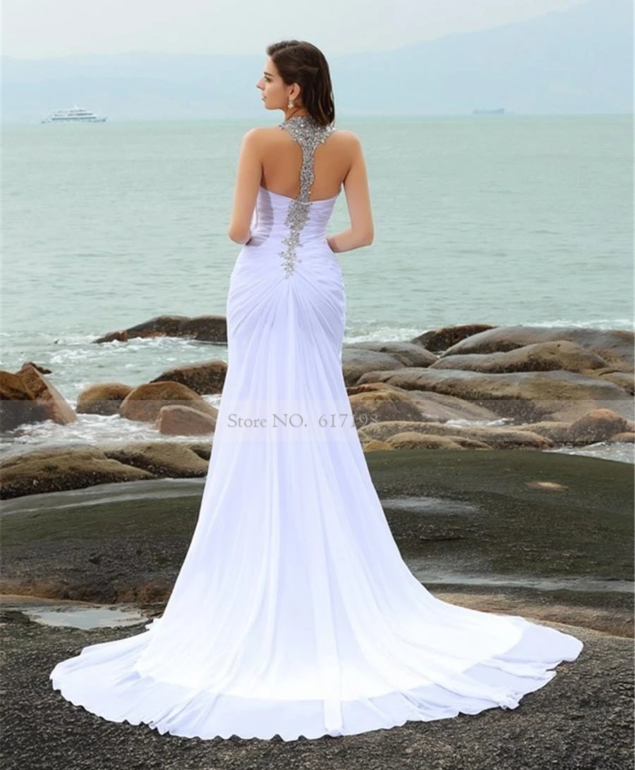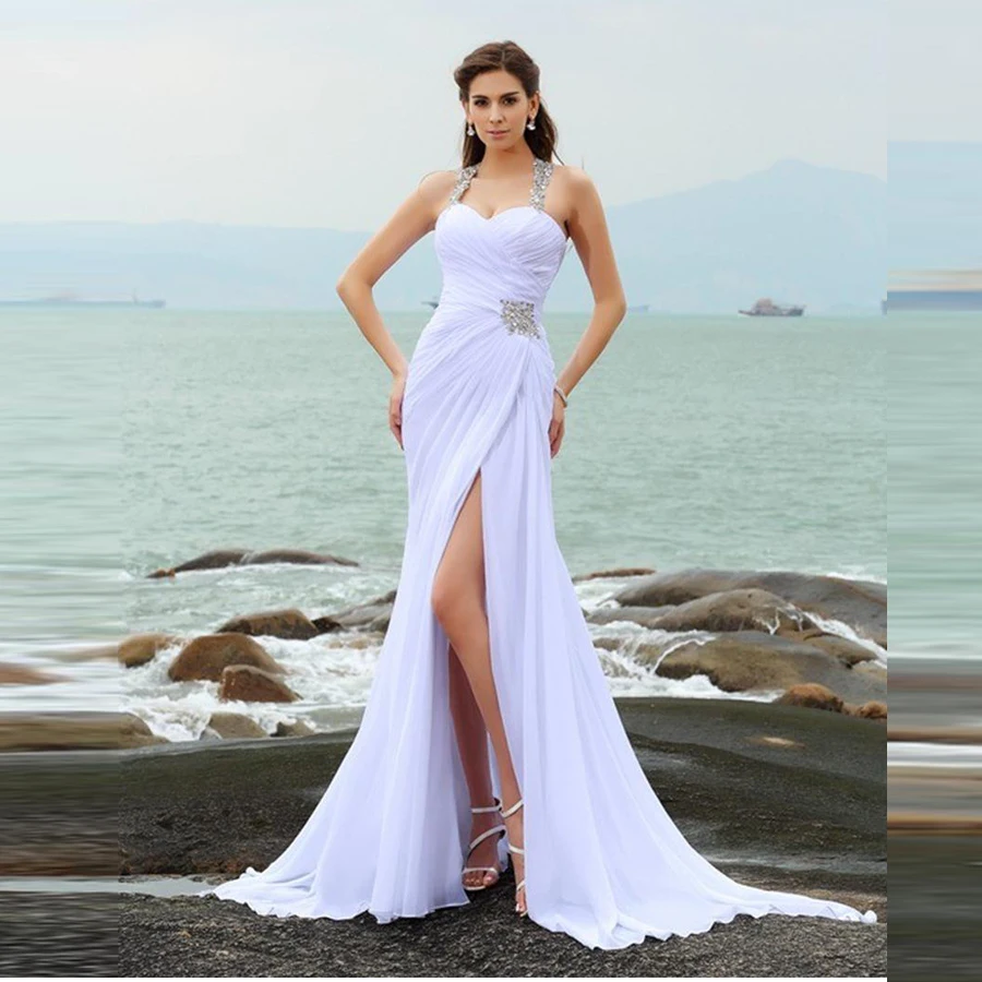 Плиссированное пляжное свадебное платье с лямкой на шее, расшитое бисером, без рукавов, с высоким разрезом, сексуальные свадебные платья, простой наряд