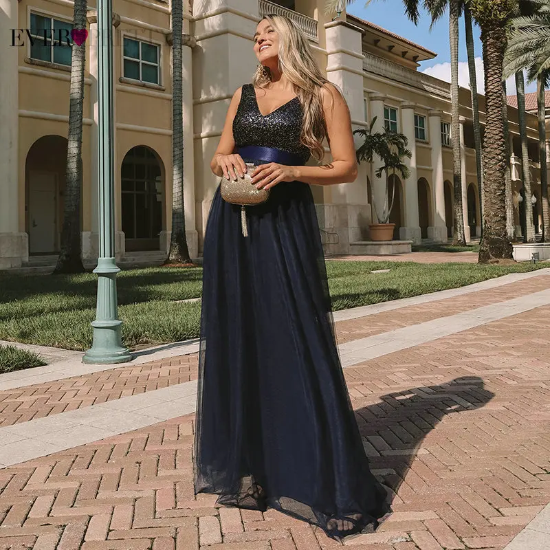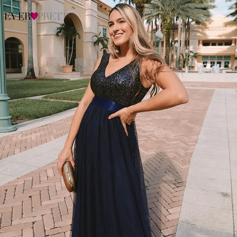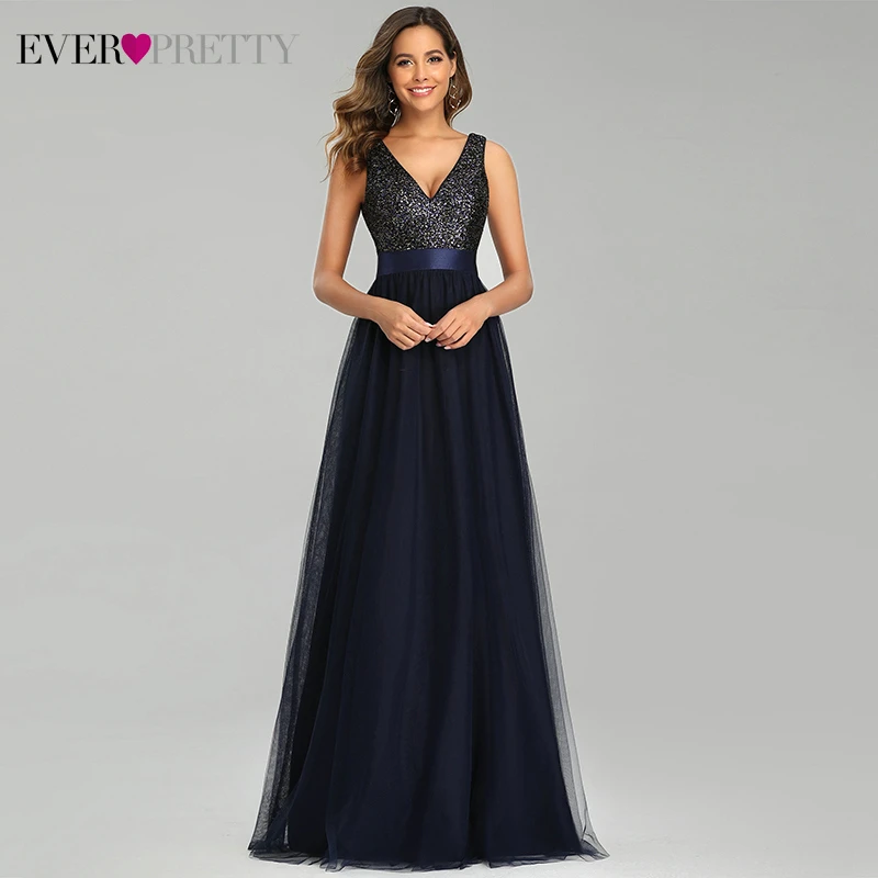 Темно-синие вечерние платья Ever Pretty EP00648NB, элегантное Тюлевое платье-трапеция с блестками и двойным V-образным вырезом без рукавов, вечерние платья