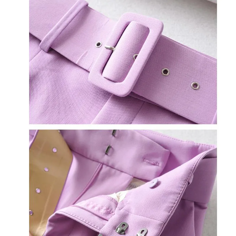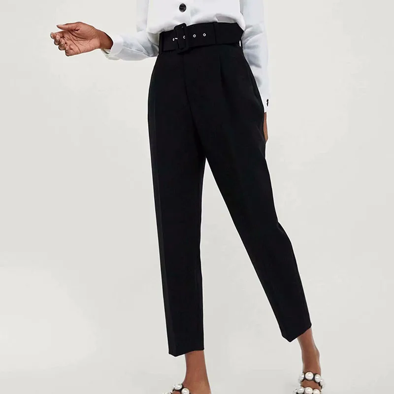 Женские офисные брюки с поясом, черные брюки с высокой талией и карманами, модные уличные брюки розового, желтого цветов с поясом