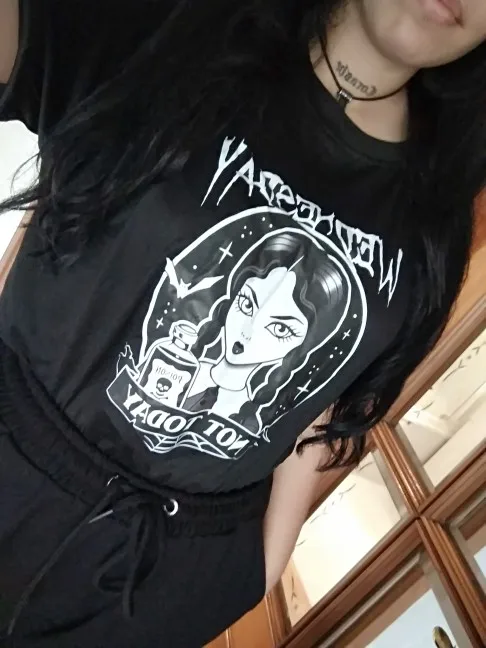 Ткань очень тонкая и хорошо просвечивается, я могу носить бак под ней. Принт четкий и милый. К сожалению, фотография очень пластиковая, я беспокоюсь о том, что она легко отшелушивается, и я абсолютно не кладу ее в сушилку, она, скорее всего, расплавится и будет разрушена. Принт такой пластиковый, что издает хрустящий звук, когда рубашка движется и сгибается. Чтобы посмотреть, что это очень мило для фотографий, но носить его не так хорошо, качество.