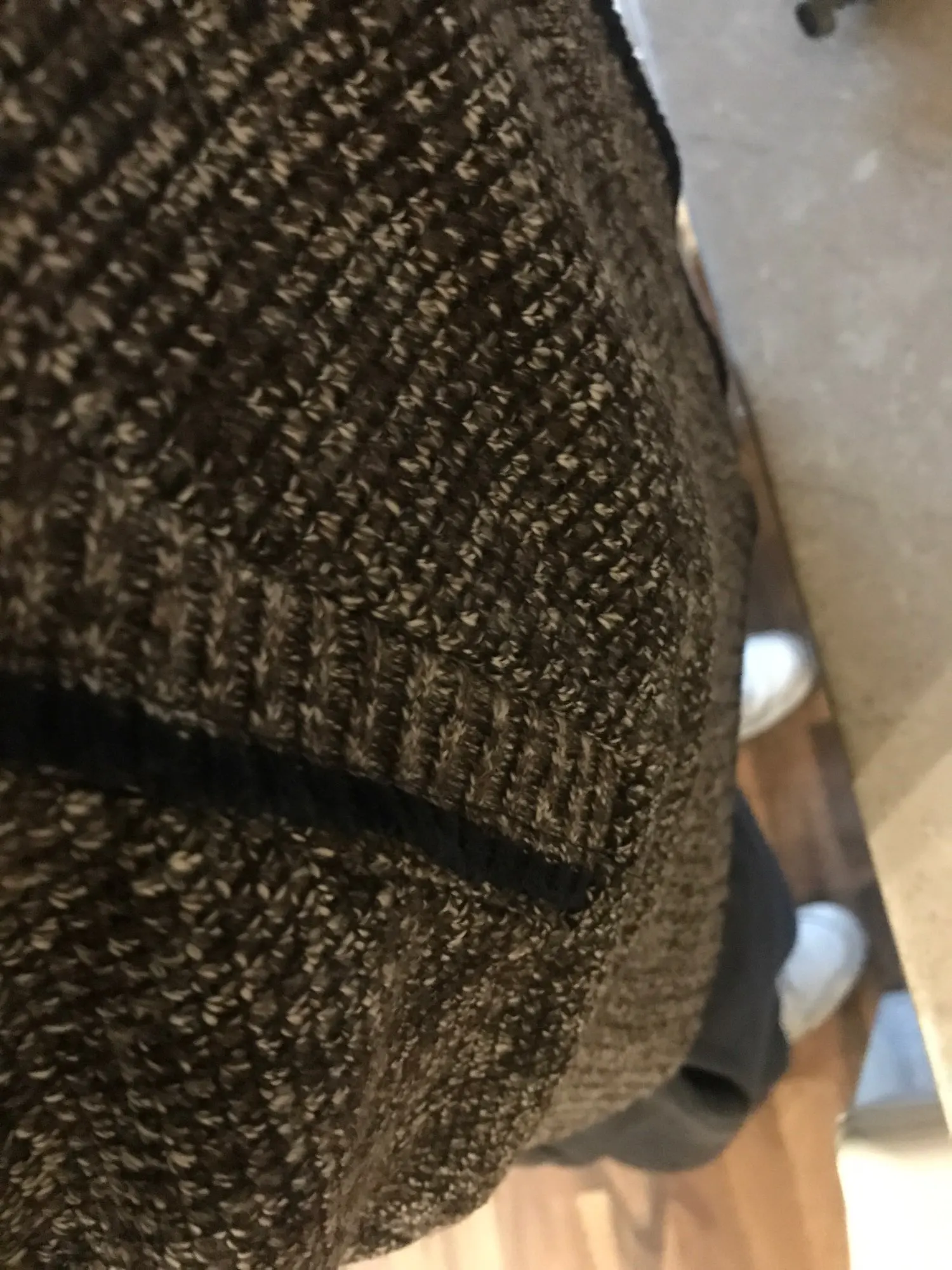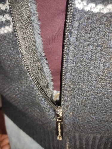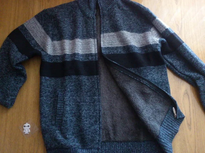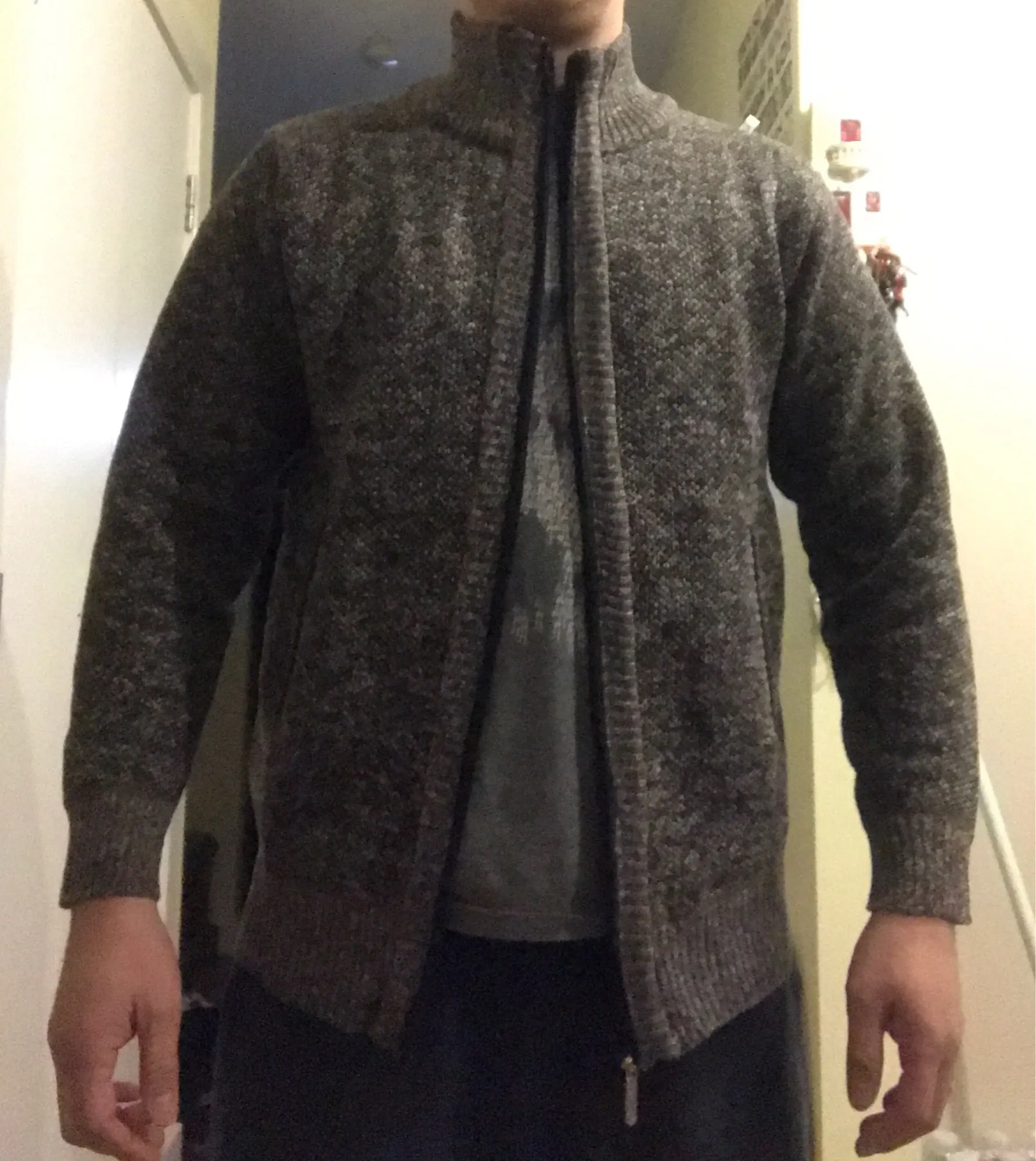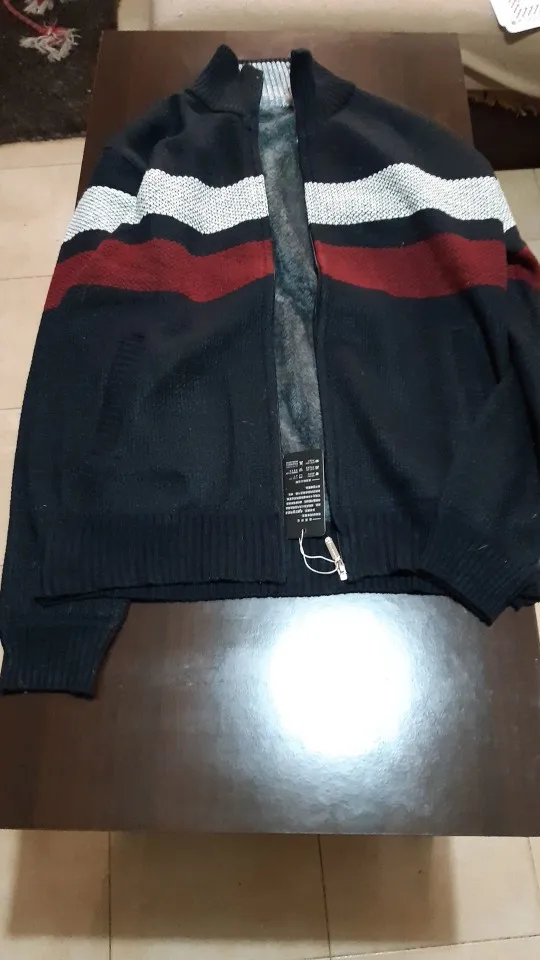 Always get the next size up. Not a winter jacket, more of causal indoor jumper. It’s medium thickness but not thick. Interesting place to have a tag on the outside shoulder. Don’t rely this as your only top coat. Still nice