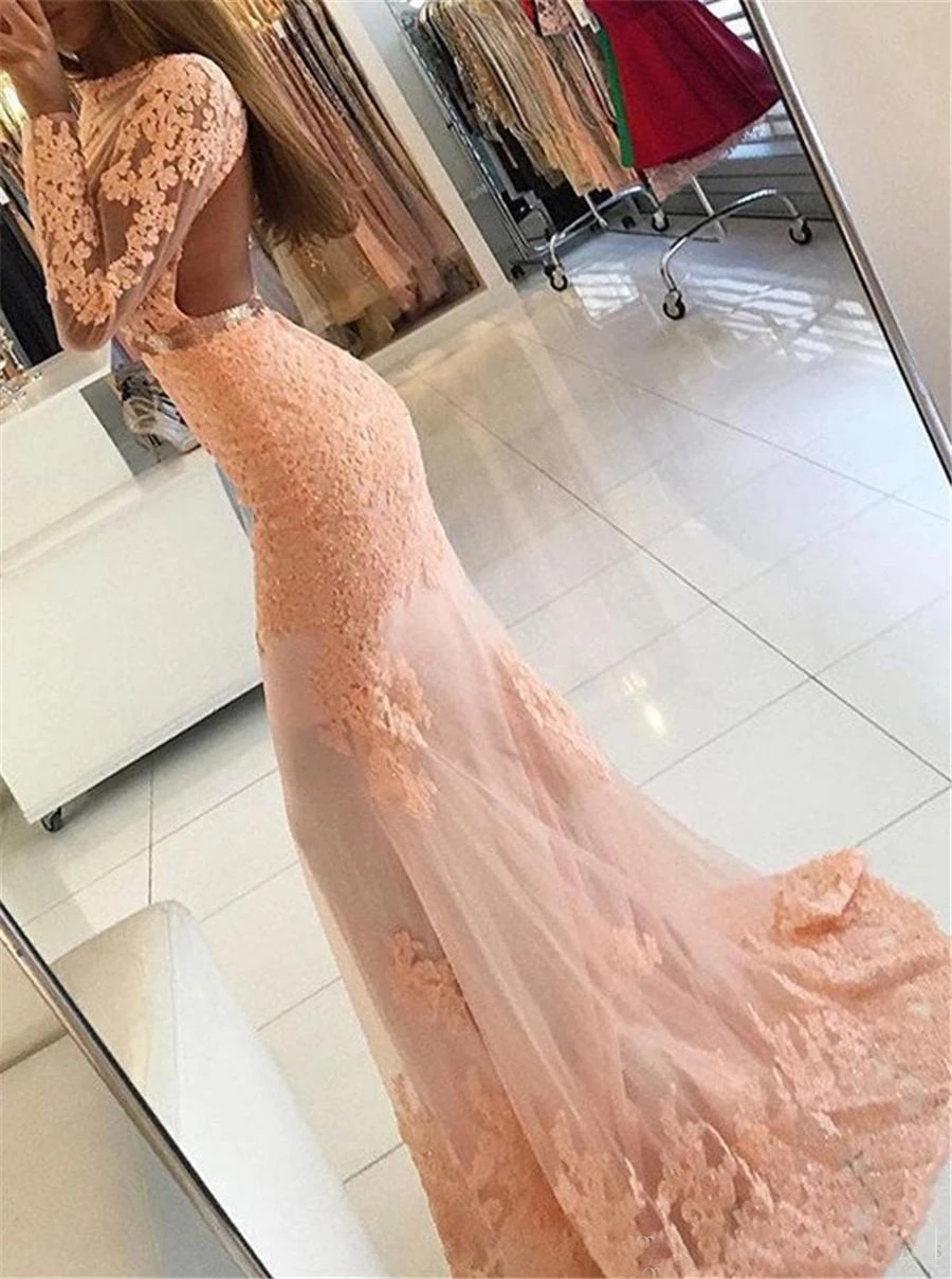 Сексуальный иллюзионный лиф с О-образным вырезом, кружевные бусины с открытой спиной, тюлевые розовые платья-русалки для выпускного вечера с длинным рукавом, женское платье