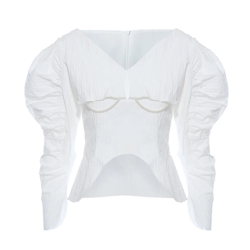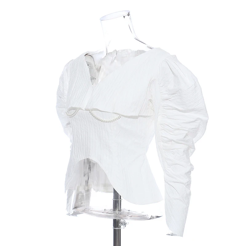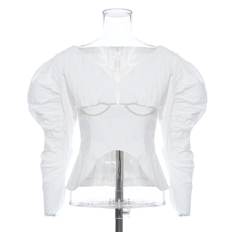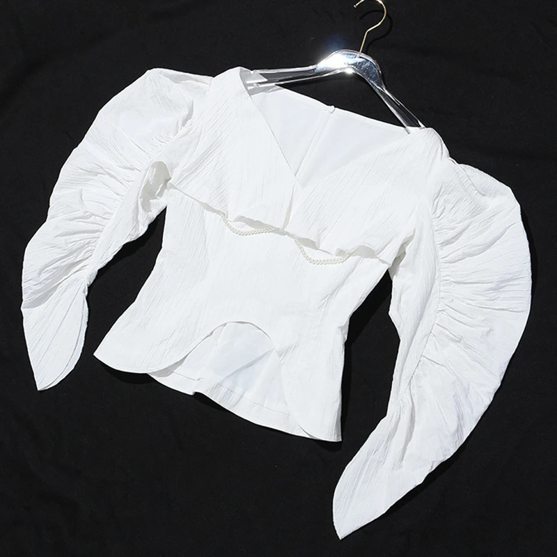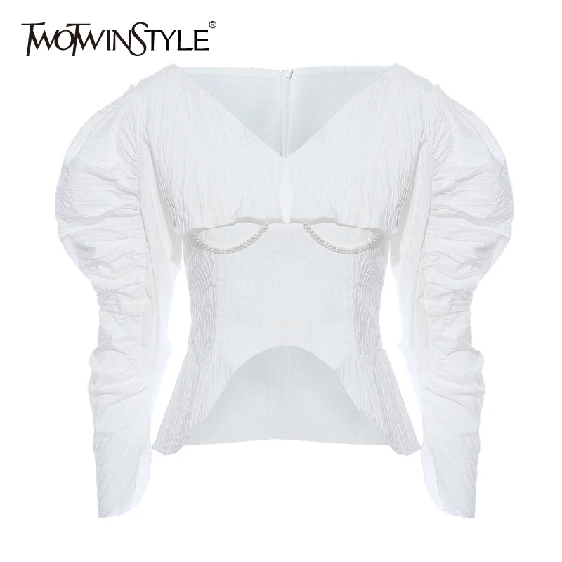 Женская блузка с буффами twotwin2, повседневная Асимметричная блузка с v-образным вырезом и длинными рукавами, расшитая бисером, в уличном стиле