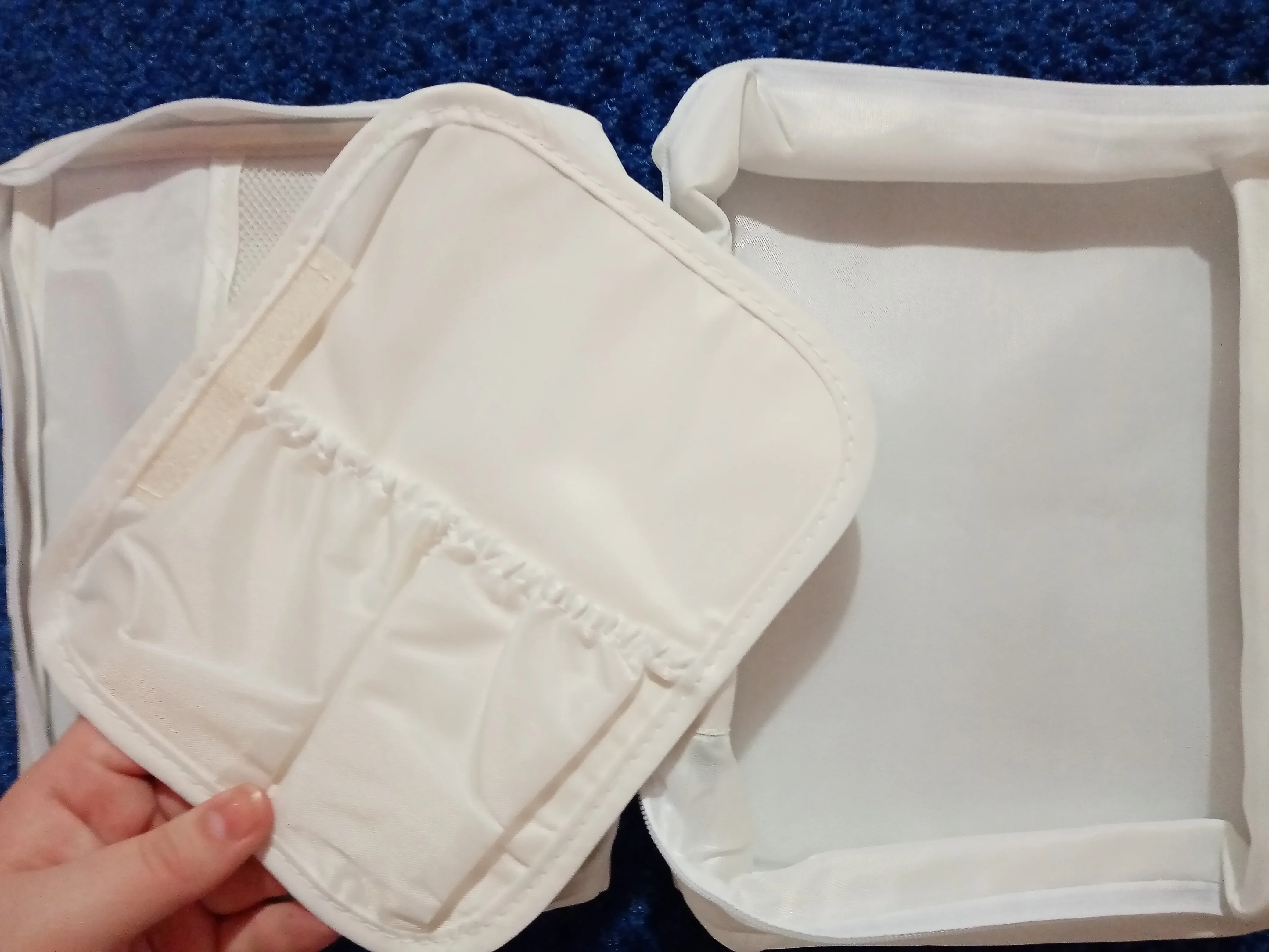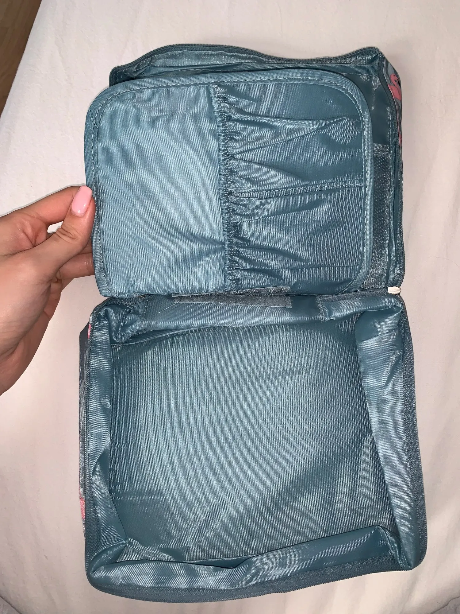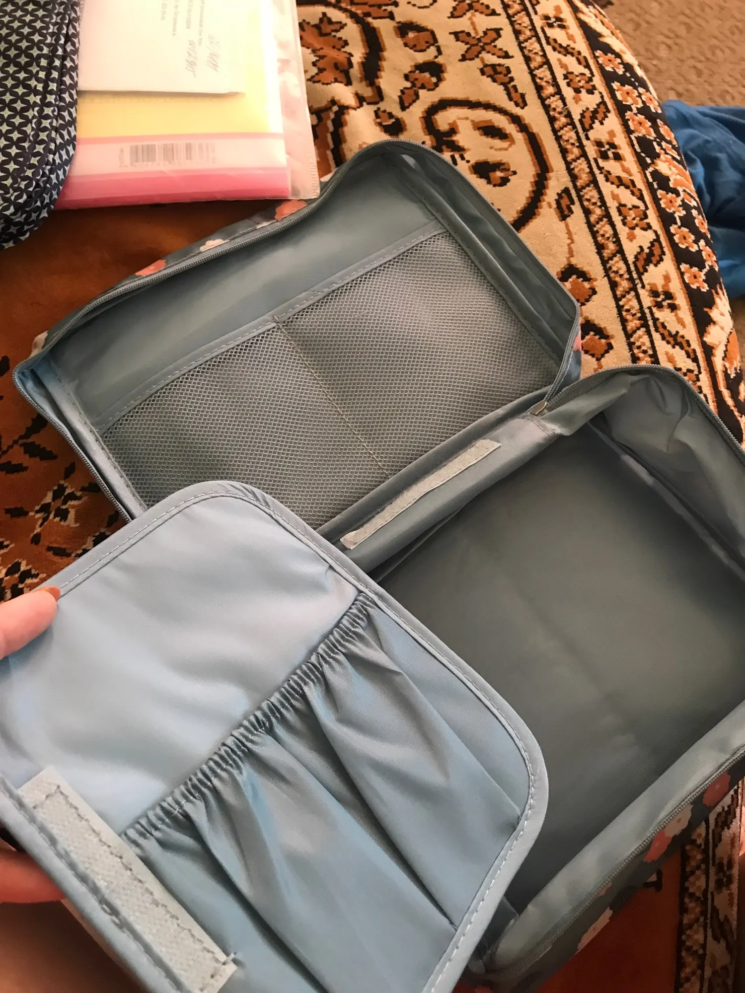 Плотный материал, хорошее качество за свои деньги. Швы сделаны не совсем аккуратно, но косметичкой довольна. Цвет чуть темнее, чем на картинке, среднее отделение на липучке, отстегивается.