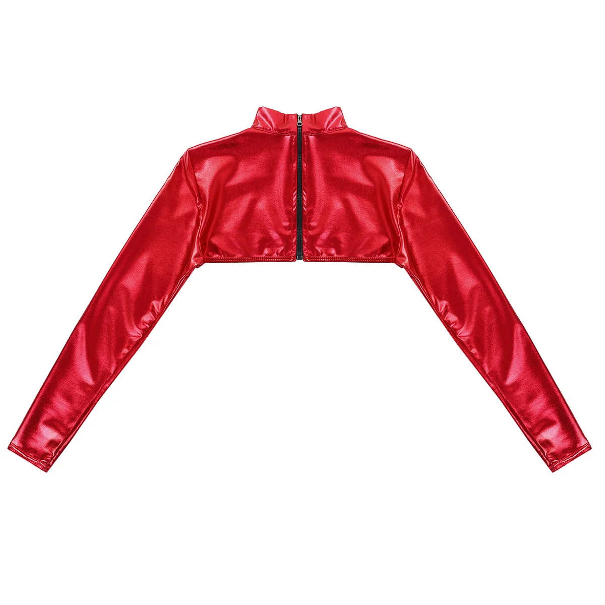 Женский Блестящий металлический укороченный топ с высоким воротом, длинными рукавами и молнией сзади, фестивальный Рейв, костюм для выступлений, для танцев на шесте