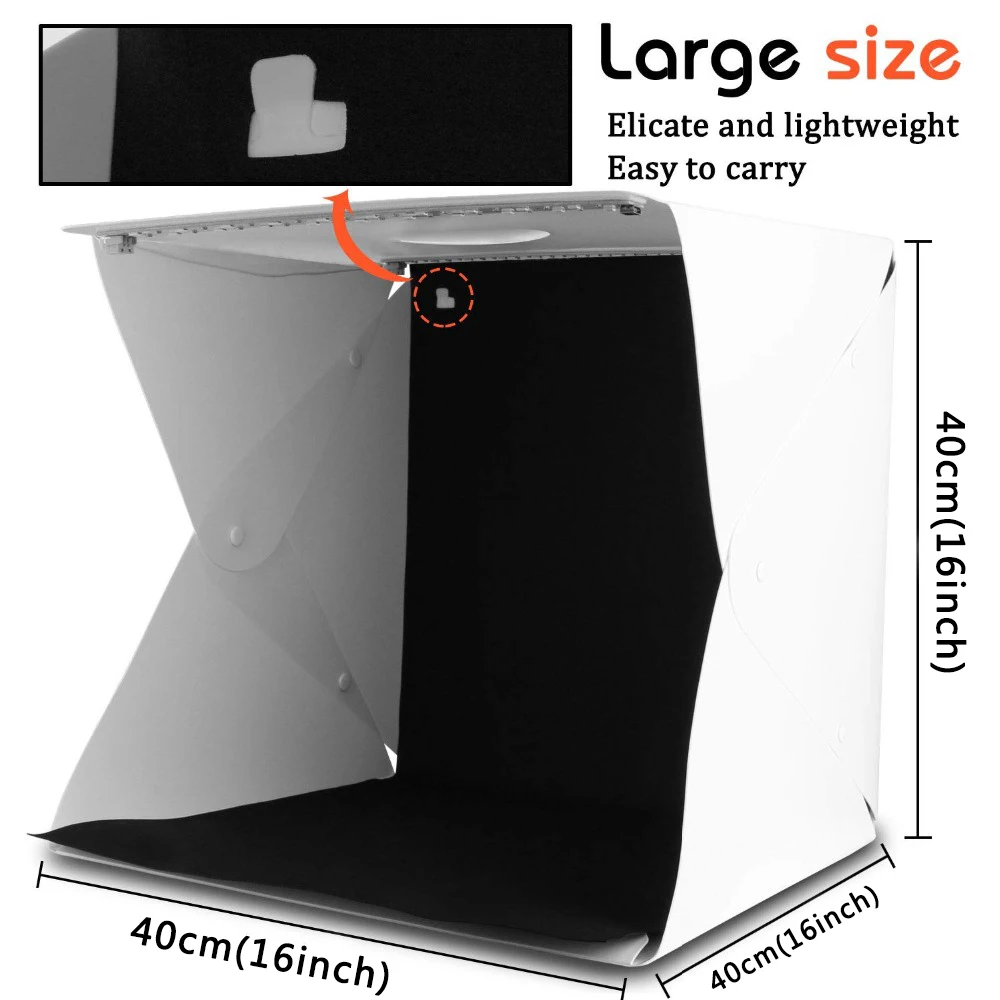 1. Встроенный 2 светодиодных индикатора и usb-кабель. Вы можете регулировать яркость светильник. С 6 фоновыми подушечками. -2. Портативная складная конструкция цепи с пряжкой, более удобная в установке и переноске, встроенная светодиодная лампа, обеспечивающая средний свет и Предотвращающая появление теней и отражений на фотографиях. -3. Соберите свою собственную фотостудию в любое время. -4. Светильник для фотосъемки предназначен для маленьких клиентов. -5. Настольная съемка позволяет быстро и легко снимать мелкие изделия, такие как ювелирные изделия, аксессуары, гаджеты и другие предметы.