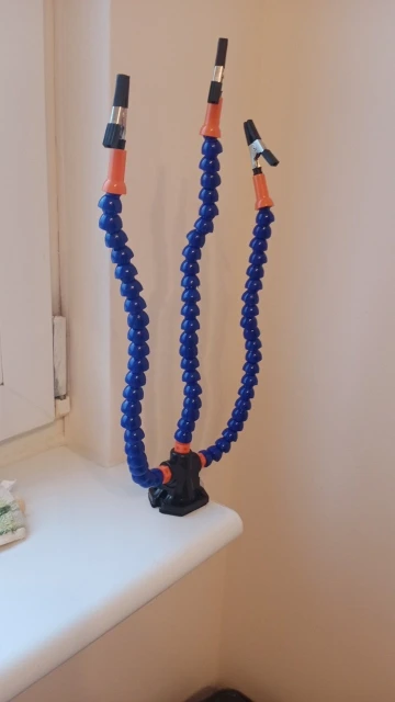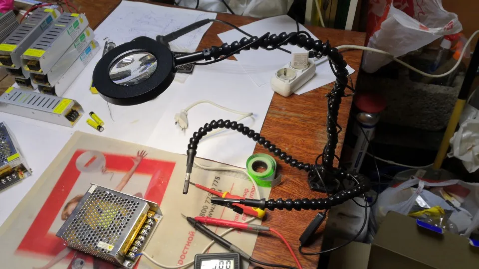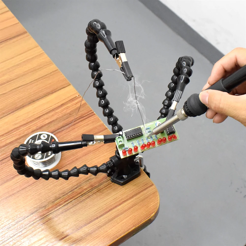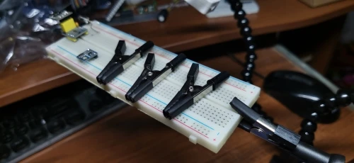 Доставили быстро, как заявлено. Качество хорошее (не стандартное применение гибкой подводки для эмульсии и держателя настольной лампы). Упаковано качественно. В комплекте 6 крокодилов, приспособа и прижим. Поводки с крокодилами без проблем удерживают макетную плату за один край. Удобная штуковина. Главное что крепится к столу, а мне это кажется весьма практичным. Особенно для зажима массивных деталей.