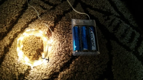 Маленькие лампочки на тонкой проволоке. Питание от блока с 2мя батарейками АА
