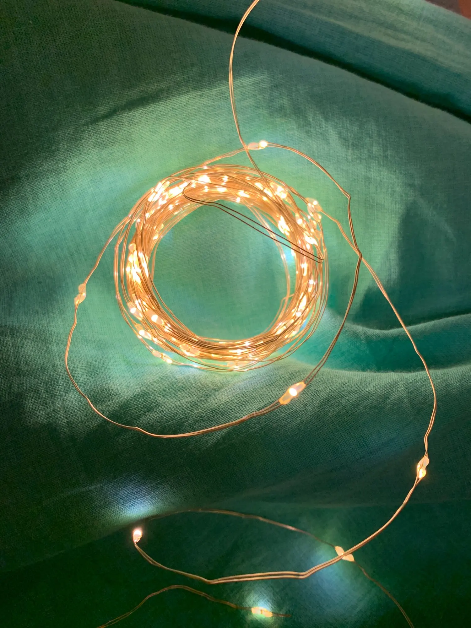 Заказала себе максимальную длину (10м), медная проволока с желтым цветом, на батарейках. Продавец мне направил в отдельном пакете прищепки, но я решила использовать гирлянду как рамку для картинки проектора (бюджетный кинотеатр дома)