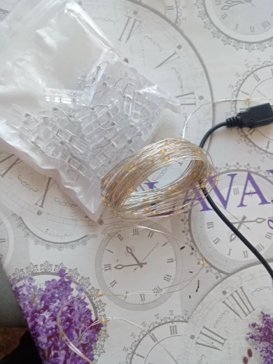 Гирлянда отличная, всё работает. Подключается через usb-адаптер. По сути, это проволока со светодиодами, поэтому ее можно гнуть, как душе угодно. Прищепки крепкие. Одна оказалась без половики, но это не страшно, поскольку в наборе их было 52.