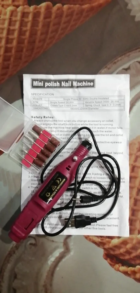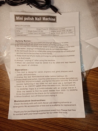 «Мини-лак для ногтей». Как в описании. Упаковано очень хорошо I. Плотная пузырчатая пленка. Никаких повреждений. Кажется очень мощным. Кабель короткий, поэтому может быть удлинен. Привести или сидеть с помощью вилки, как должно быть подключено и подключено использовать. Я бы порекомендовал это устройство. Он легкий, как сделано из пластика, но я не чувствую, что он очень легко сломается. Сверла также хорошего качества. Я хотел бы вернуть еще. Отлично подходит для h tv e по цене