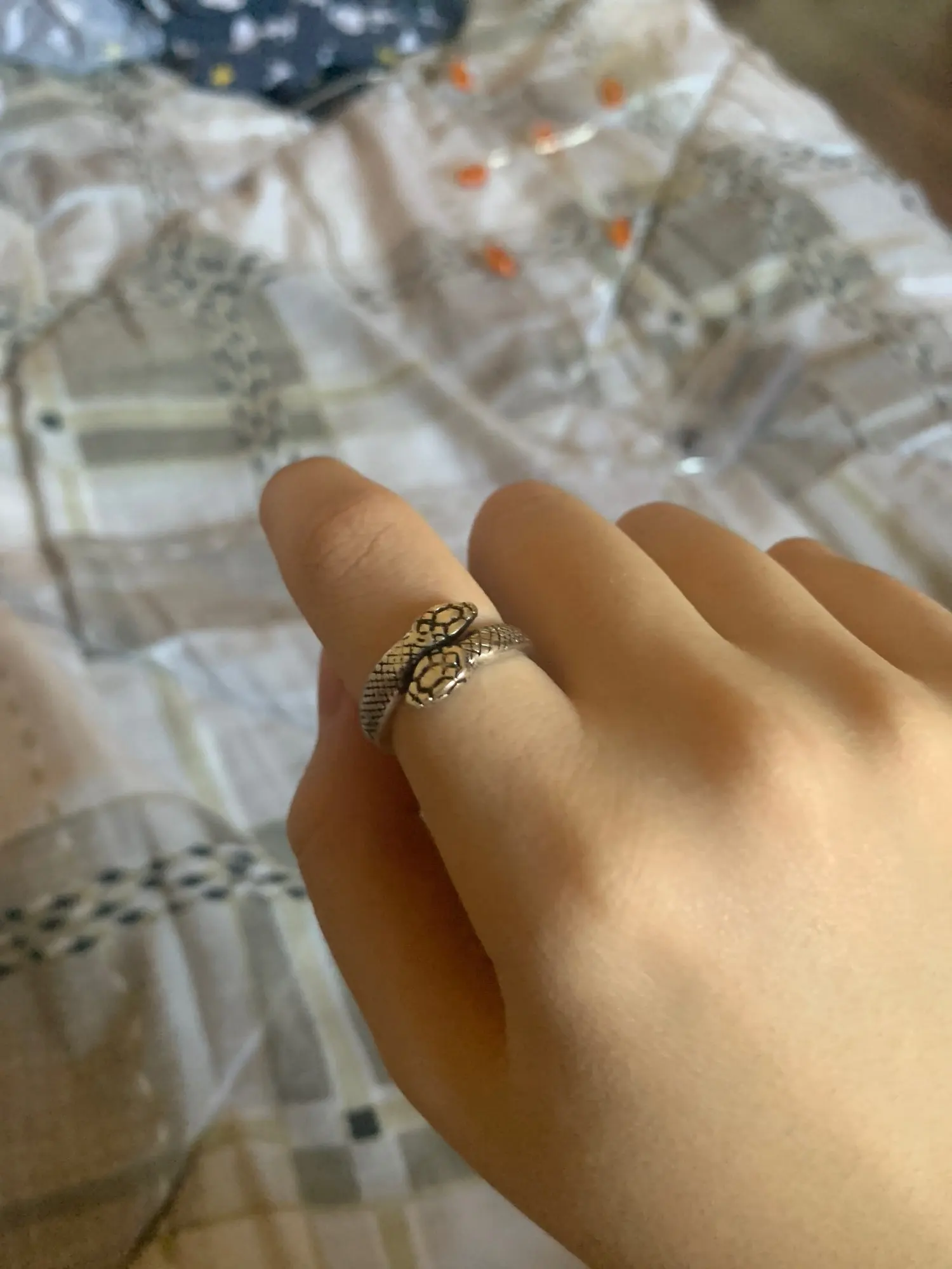 Милое колечко, размер свободно регулируется, смотрится красиво . Единственный минус - цвет, не полностью серебряный, как ожидала, местами чёрные «пятна» , которые при долгом ношении могут отпечататься на вашем пальце . Доставка была неожиданно долгой, но это не страшно