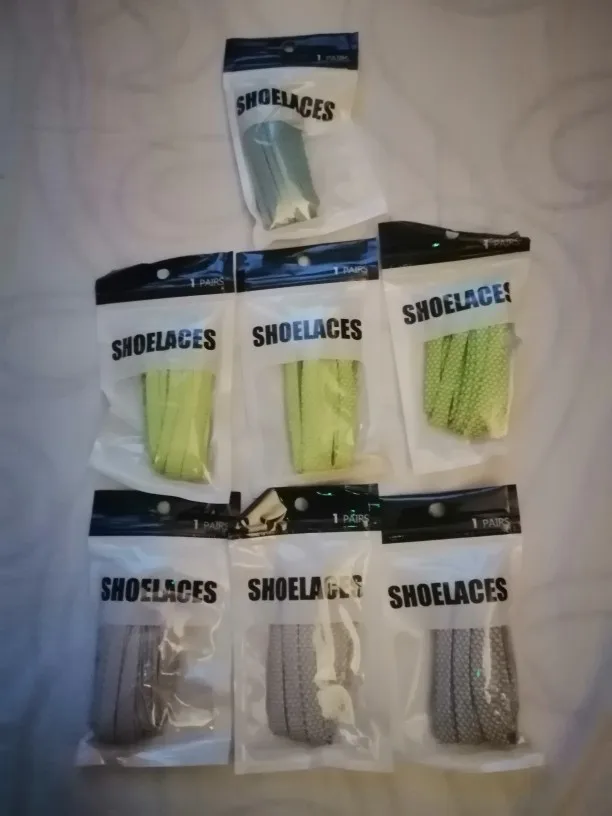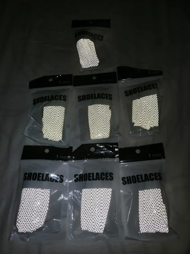 Доставка месяц до Калининградской области, прислали вместе с другими посылками, плоские, заявленной длине соответствуют, насчёт светоотражающих свойств не уверена, на вид крепкие, рисунок смотрится интересно.