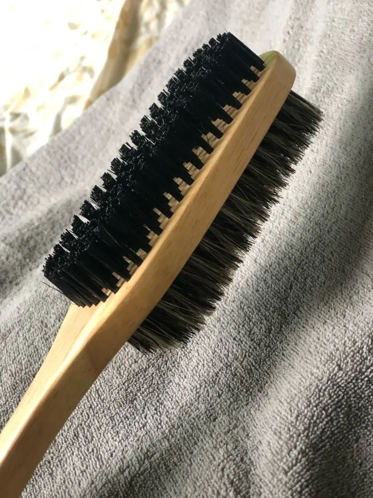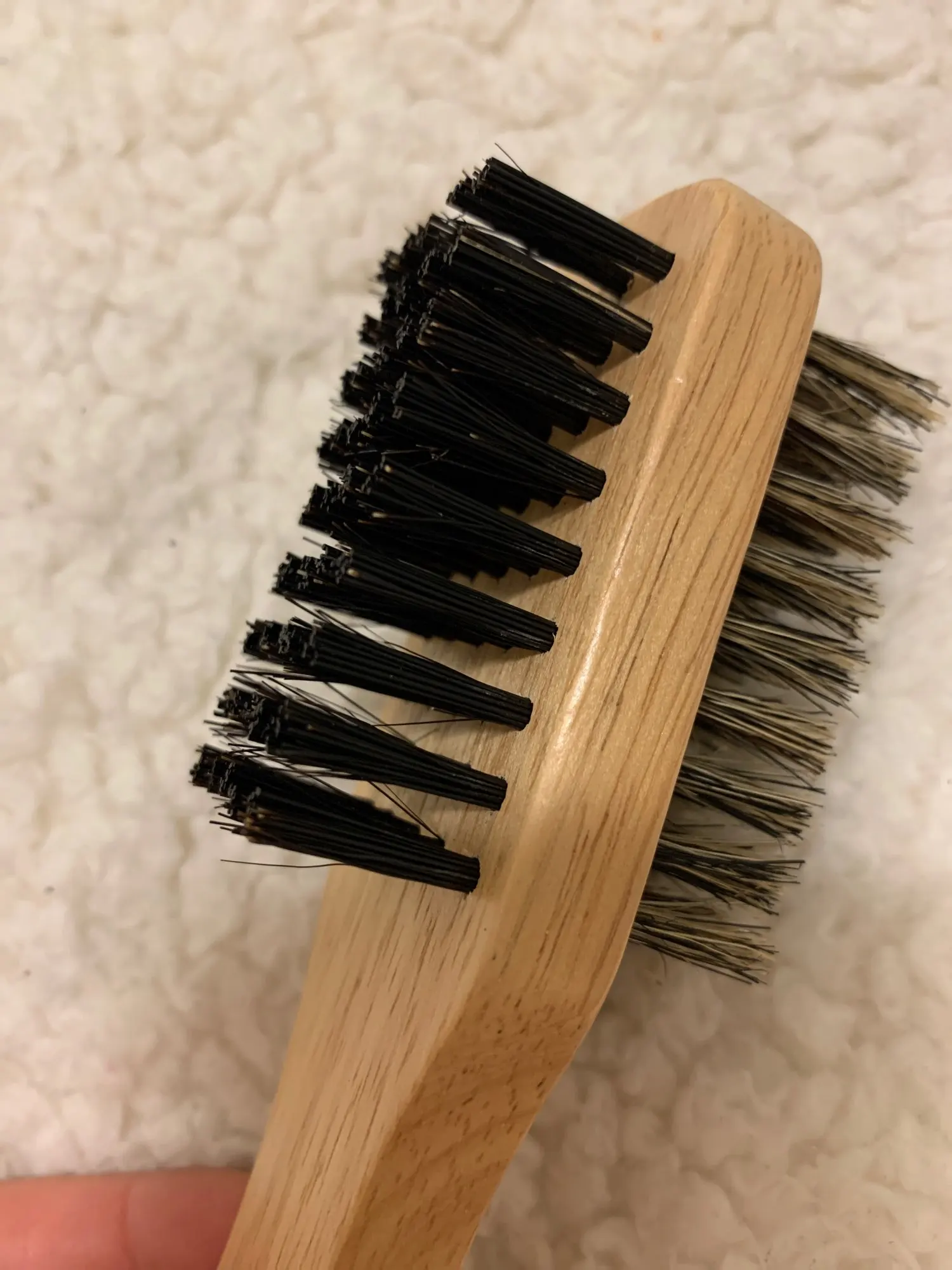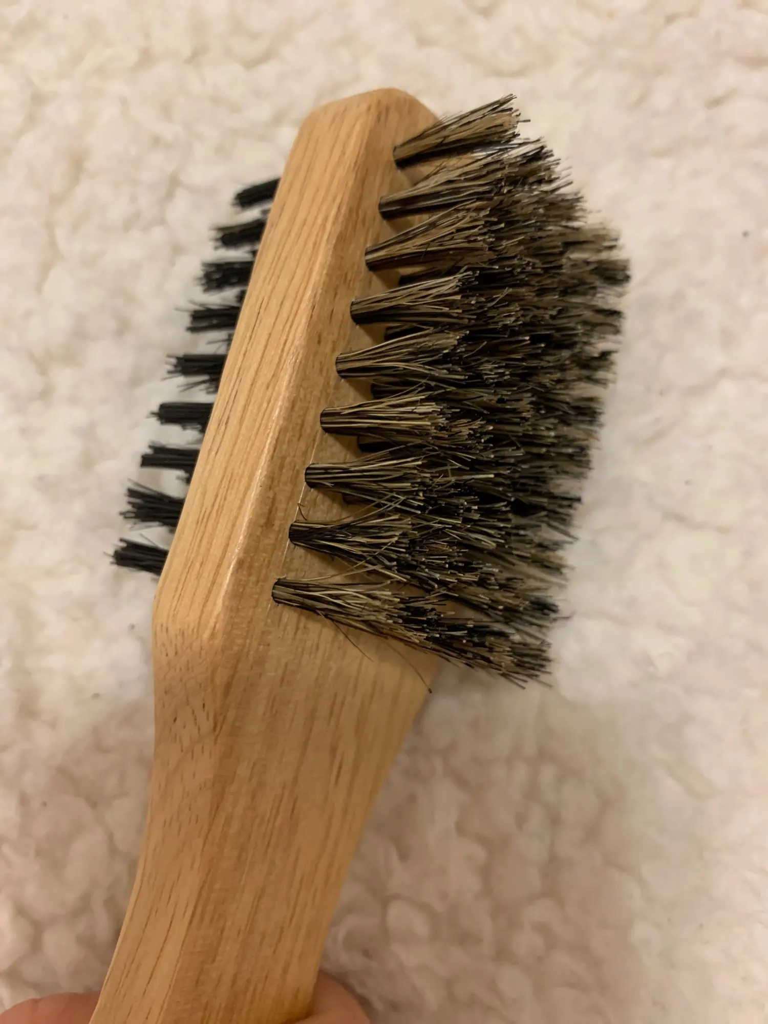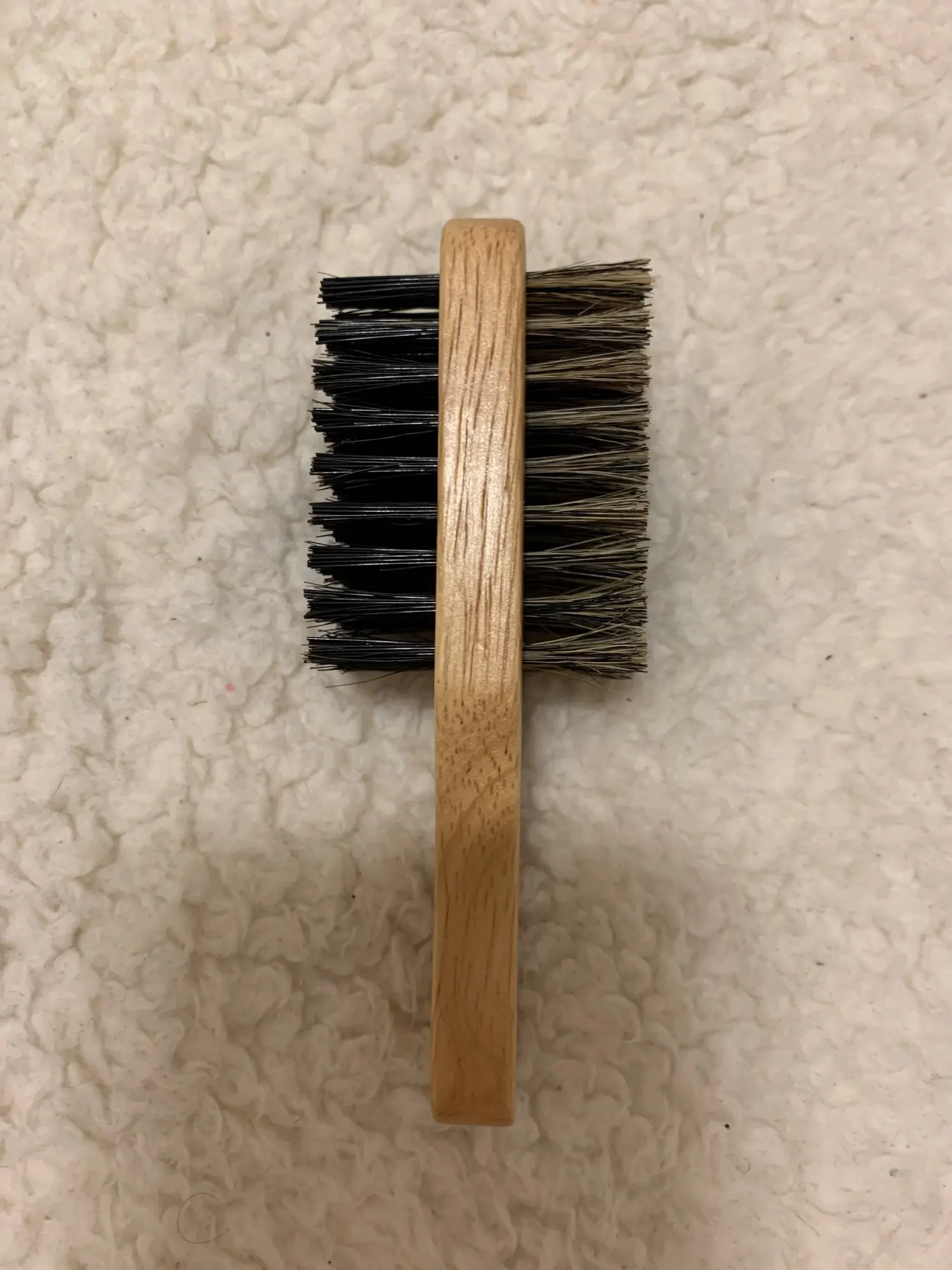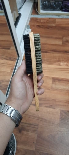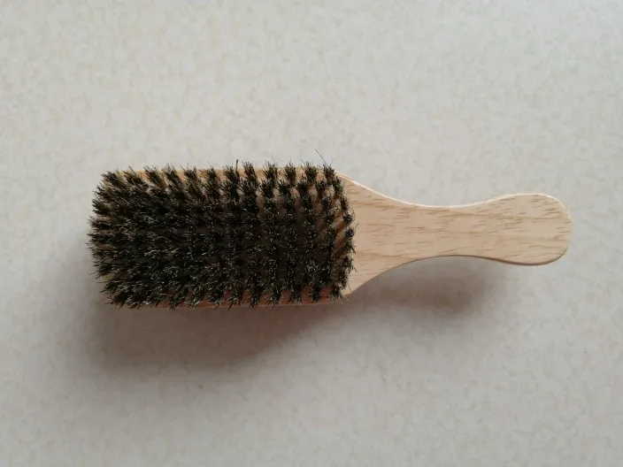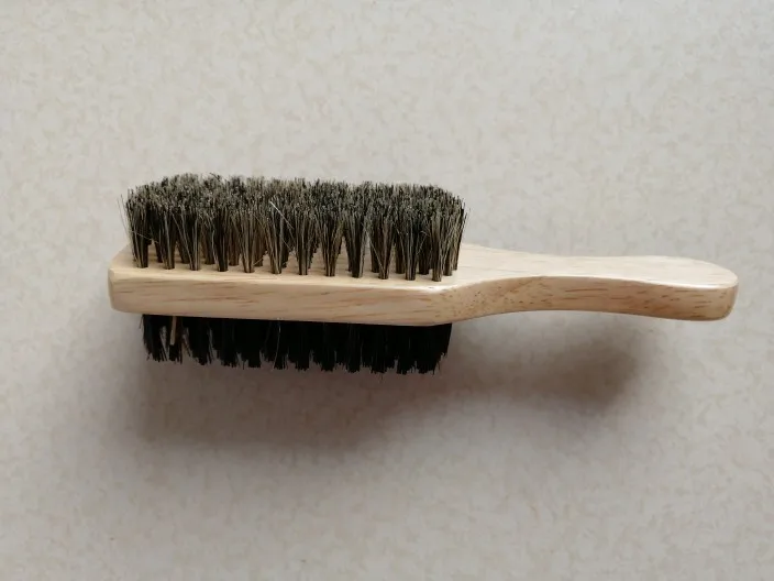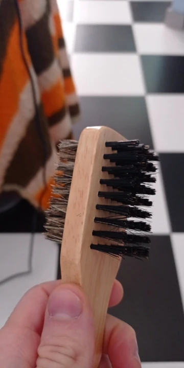 С одной стороны жёсткая щетина, царапает кожу, с др стороны--мягкая. Я использую только мягкую для мужских стрижек, мне нравится