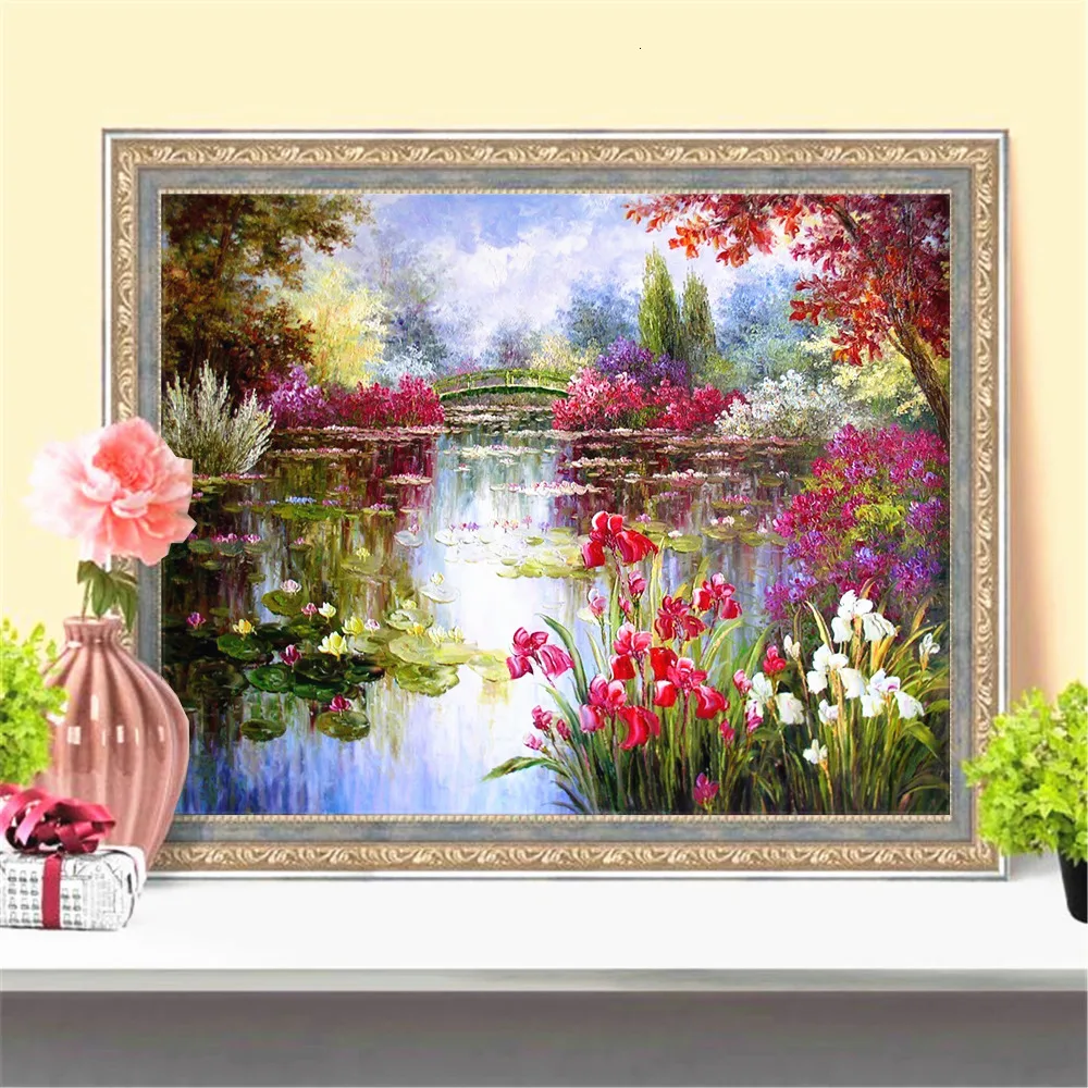 Полноформатная алмазная живопись, пейзаж 5D, Алмазная мозаика сделай сам, картина с изображением озера и цветов, алмазная вышивка, Декор для дома