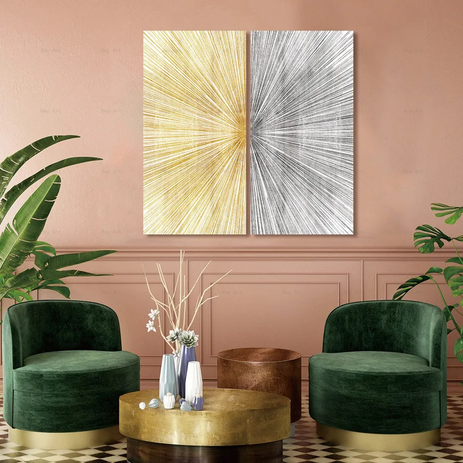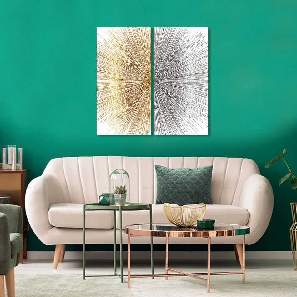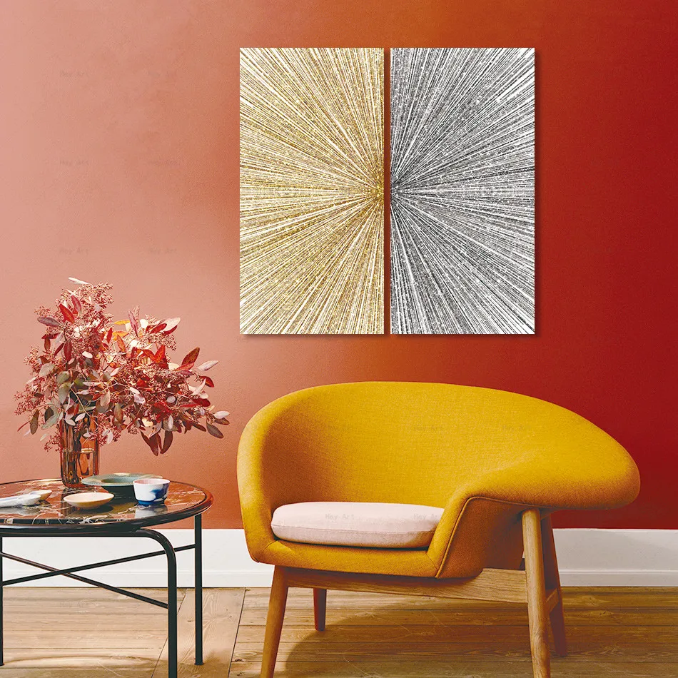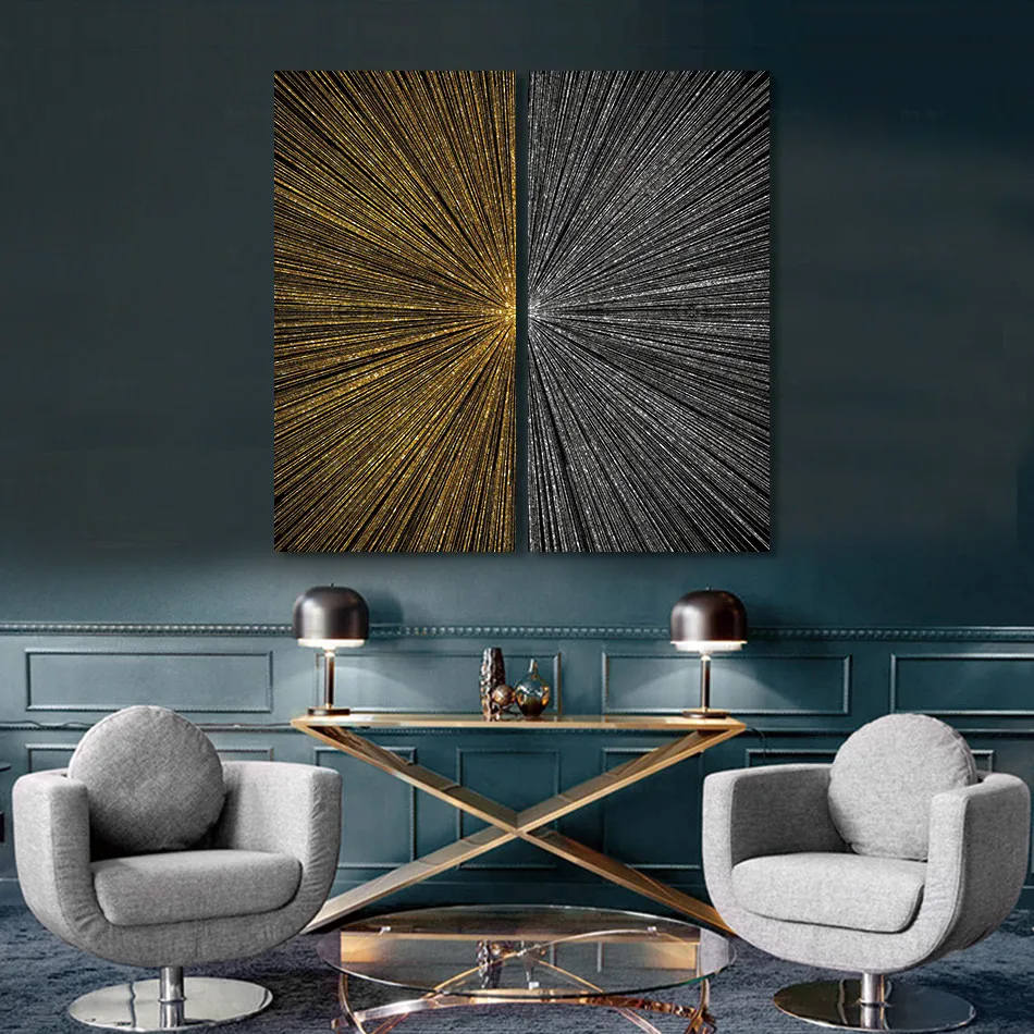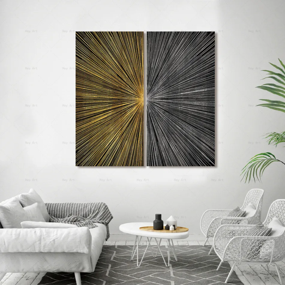 Абстрактные плакаты с черными на белых 2 панелями, постеры с геометрическими линиями золотого и серебряного цвета, Картина на холсте, настенное искусство, домашний декор