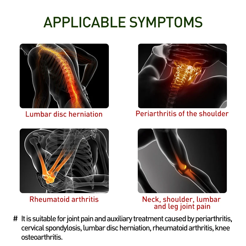 Шейный спондилез, ревматизм, периартрит, поясничные боли и боли в ногах, грыжа поясничного диска, растяжение поясничных мышц, ишиас, шпоры костей, гиперплазия костей, кровоподтеки