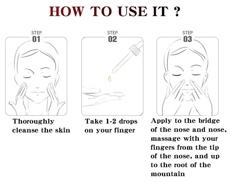 1. Очистите лицо теплой водой и высушите.2. Удалите 1-2 капли эфирного масла с безынерного пальца,3. Нанесите кольцевые пальцы обеих рук вокруг носа, потяните их к переносице и мягко помассируйте до впитывания. (Повторяется много раз, эффект лучше.)