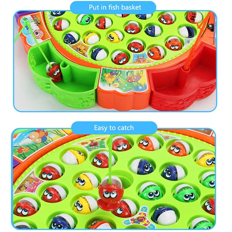 Вращающийся рыбацкий бассейн с музыкой Интересную игру можно играть вместе с семьей и друзьями Улучшение моторики, творческих способностей и логического мышления малыша, координация глаз и рук Рыболовные игрушки изготовлены из высококачественного сырья, твердость намного прочнее обычных, и нет запаха для малыша, чтобы пользоваться с уверенностью. С музыкальным сопровождением музыка привлекает внимание малыша во время игры, и поет вместе, чтобы улучшить чувство музыки малыша.