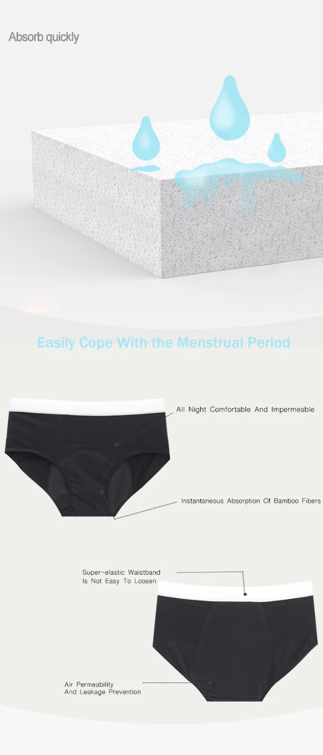 1. Менструальные трусики Он может удерживать до большого количества жидкости, вы можете носить наши менструальные трусики без каких-либо подушечек, это принесет комфорт;