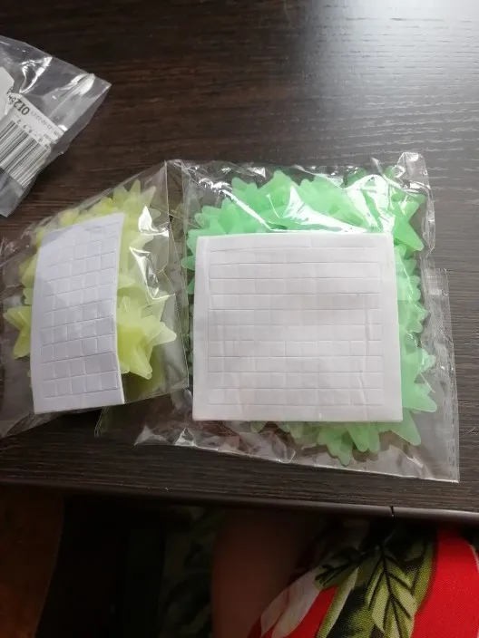 Товар хороший, светятся ярко. Не самоклеящиеся, клей наносится самостоятельно