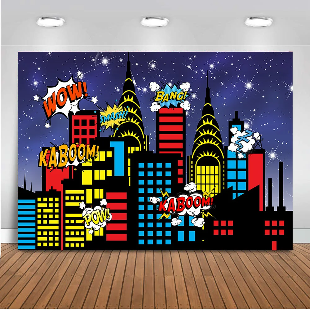 Супер герой день рождения фон для фотосъемки ночь город красочные здания новорожденные дети день рождения фон блестящее небо