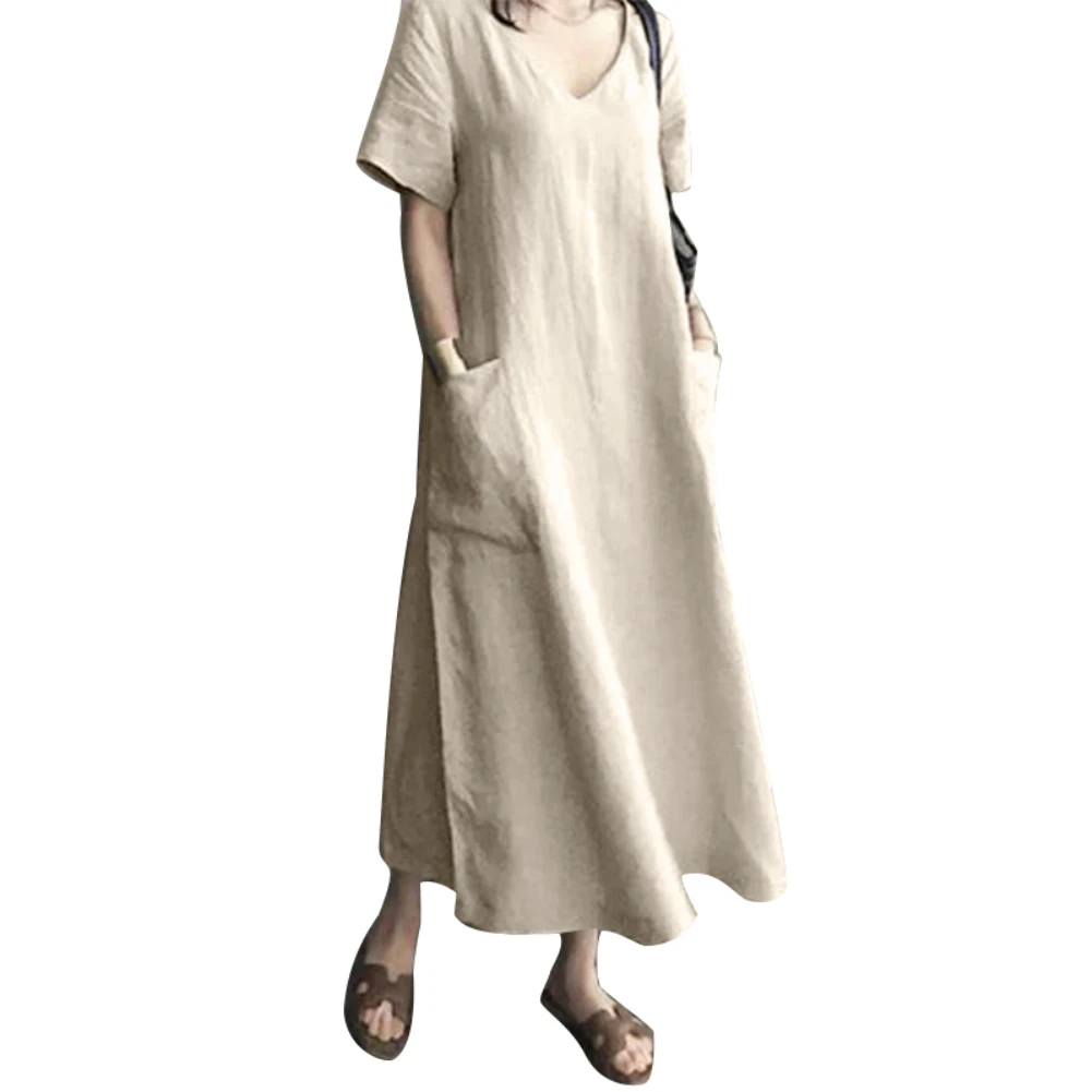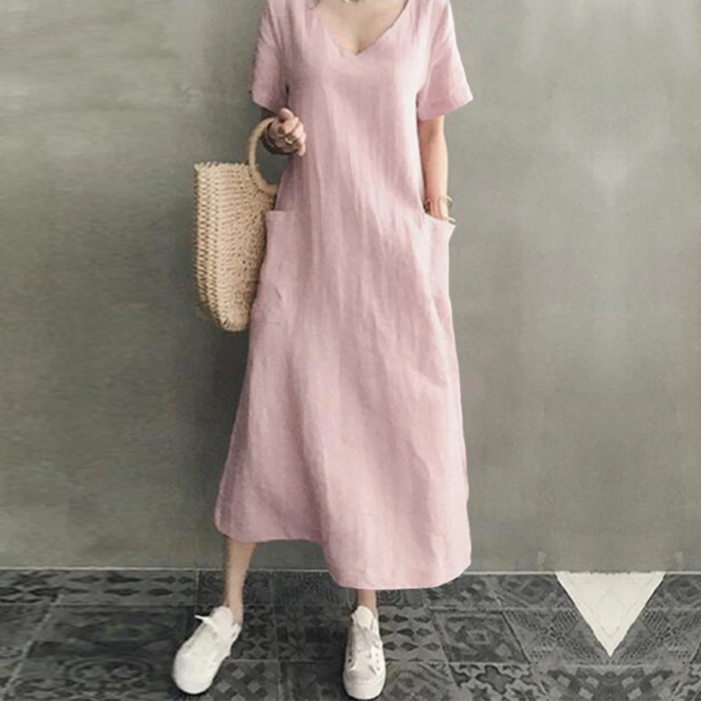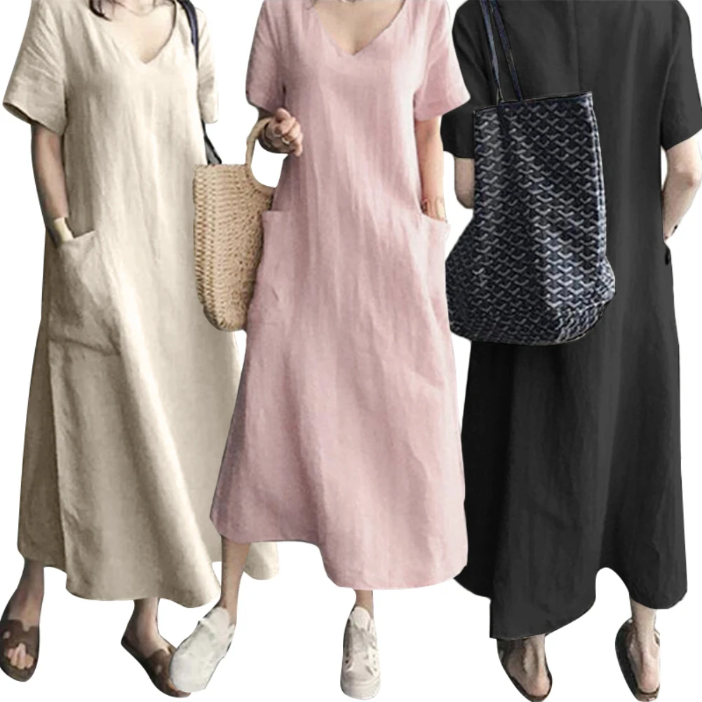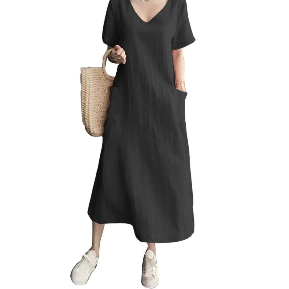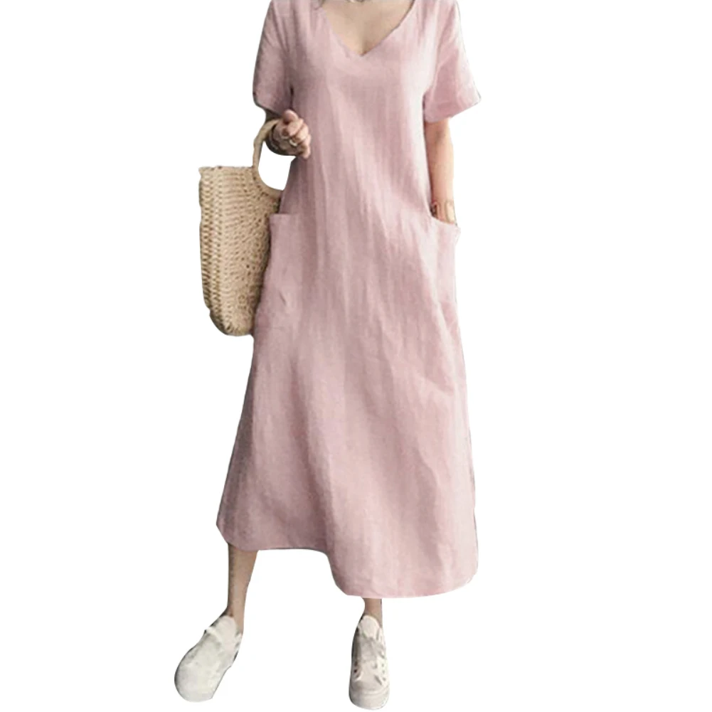 Женское Повседневное платье с коротким рукавом, однотонное Свободное длинное платье с V-образным вырезом и карманами, с большим подолом, S-4XL