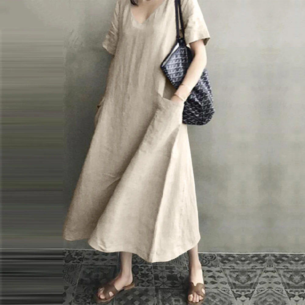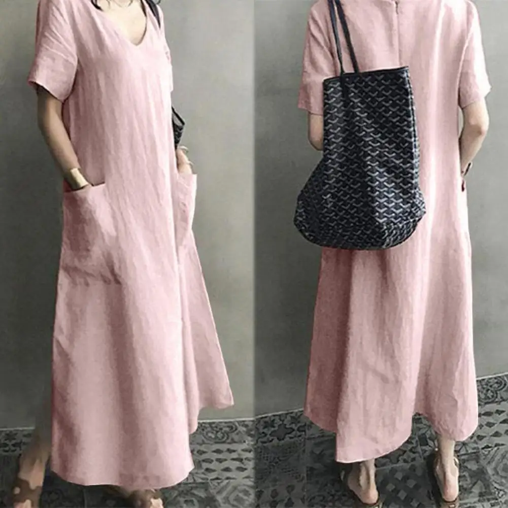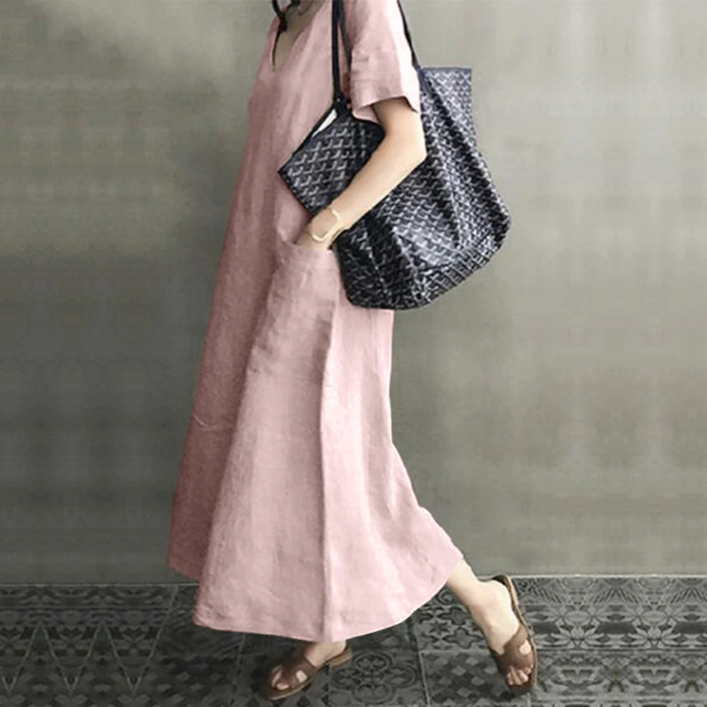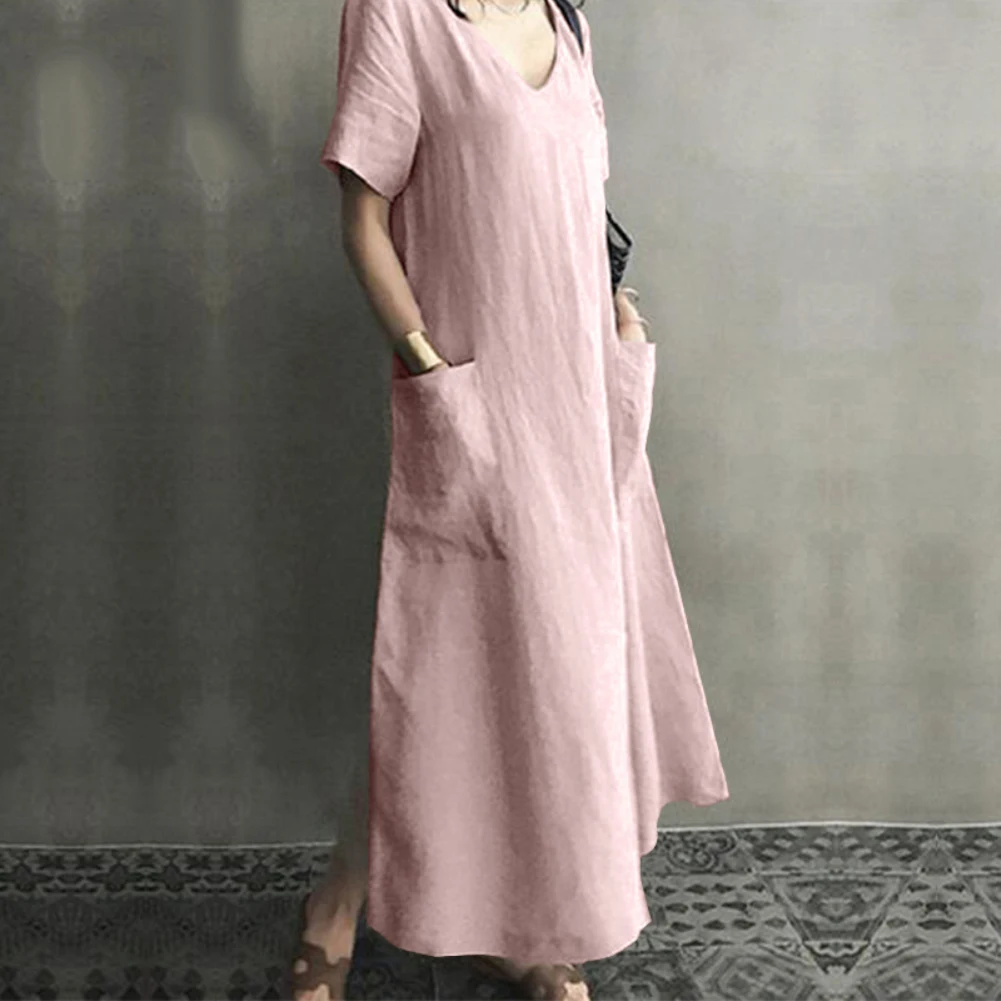 Женское Повседневное платье с коротким рукавом, однотонное Свободное длинное платье с V-образным вырезом и карманами, с большим подолом, S-4XL