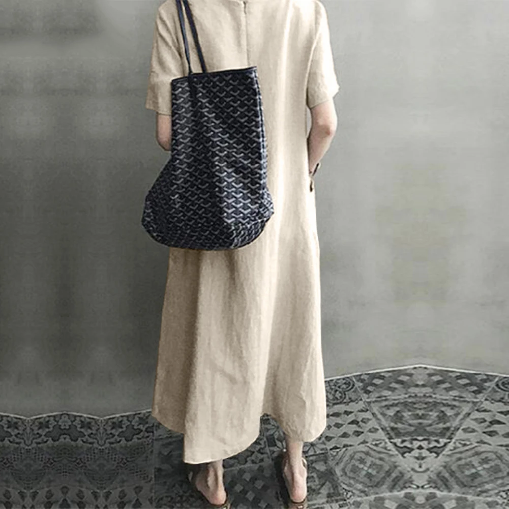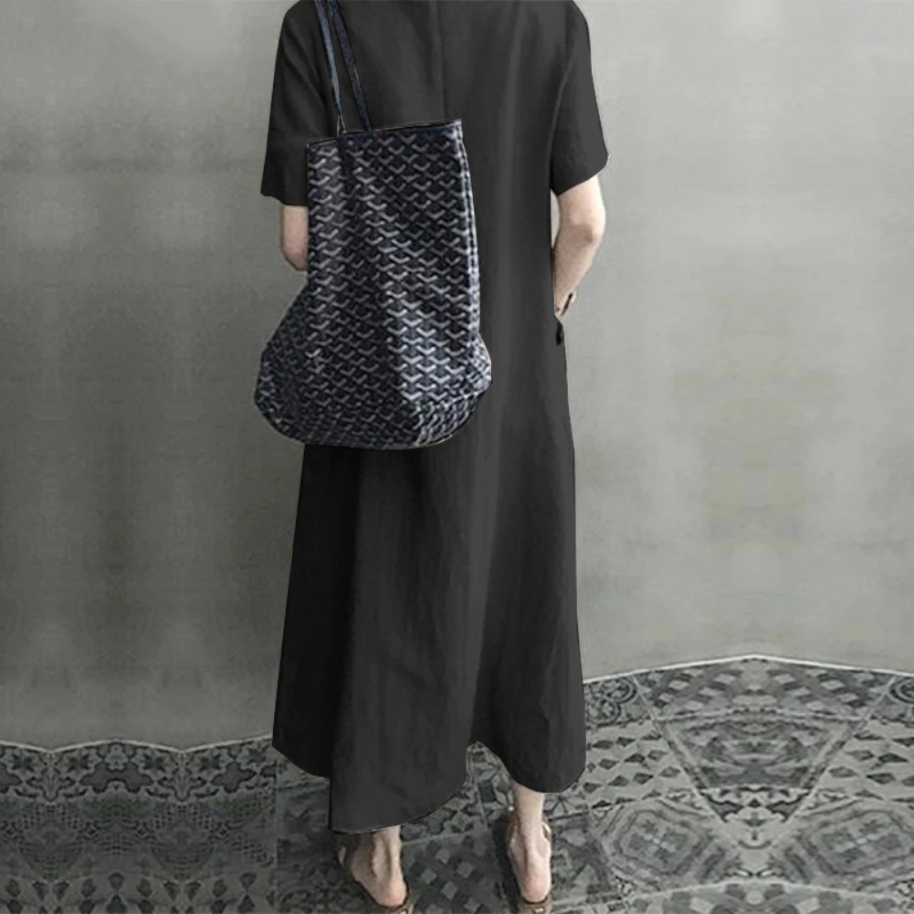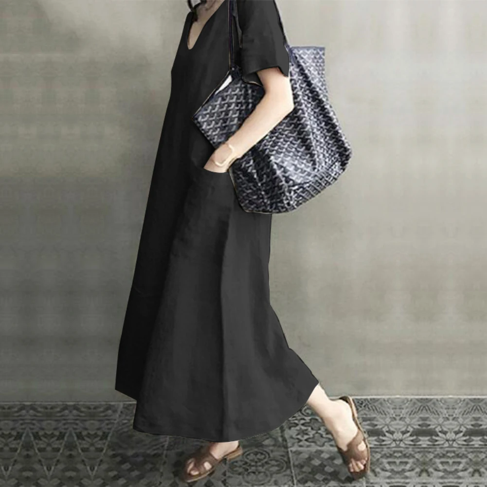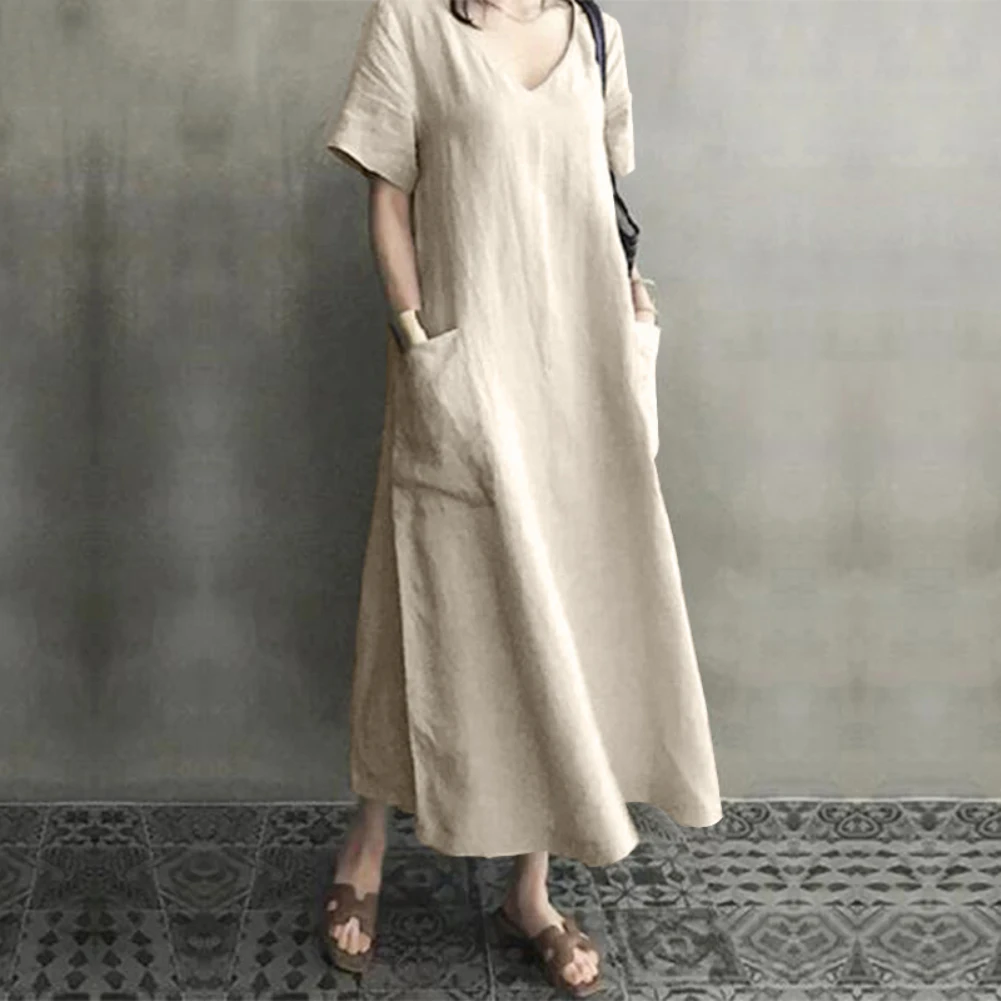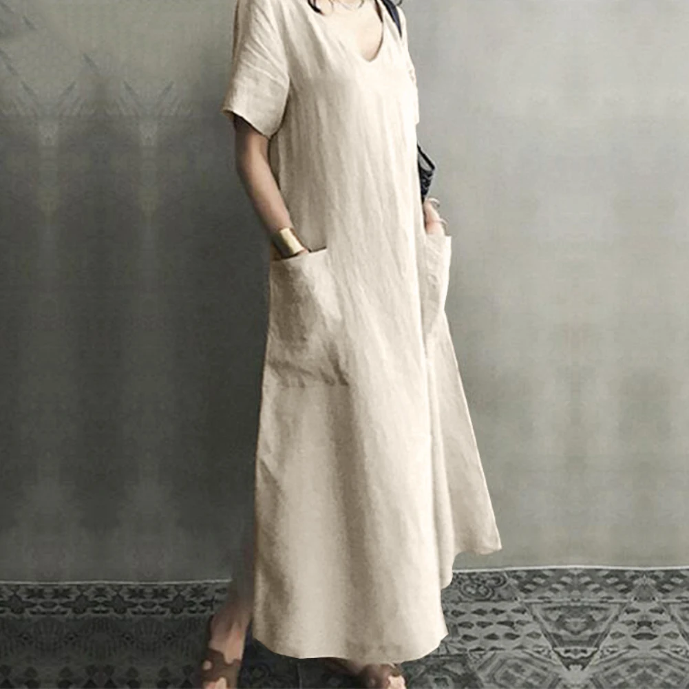 Женское Повседневное платье с коротким рукавом, однотонное Свободное длинное платье с V-образным вырезом и карманами, с большим подолом, S-4XL