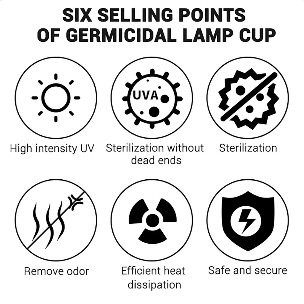 UVC лучи вредны для глаз и кожи, поэтому, когда лампа включена, не смотрите прямо на лампу. Когда свет работает, люди/Домашние животные/растения должны выйти из комнаты.